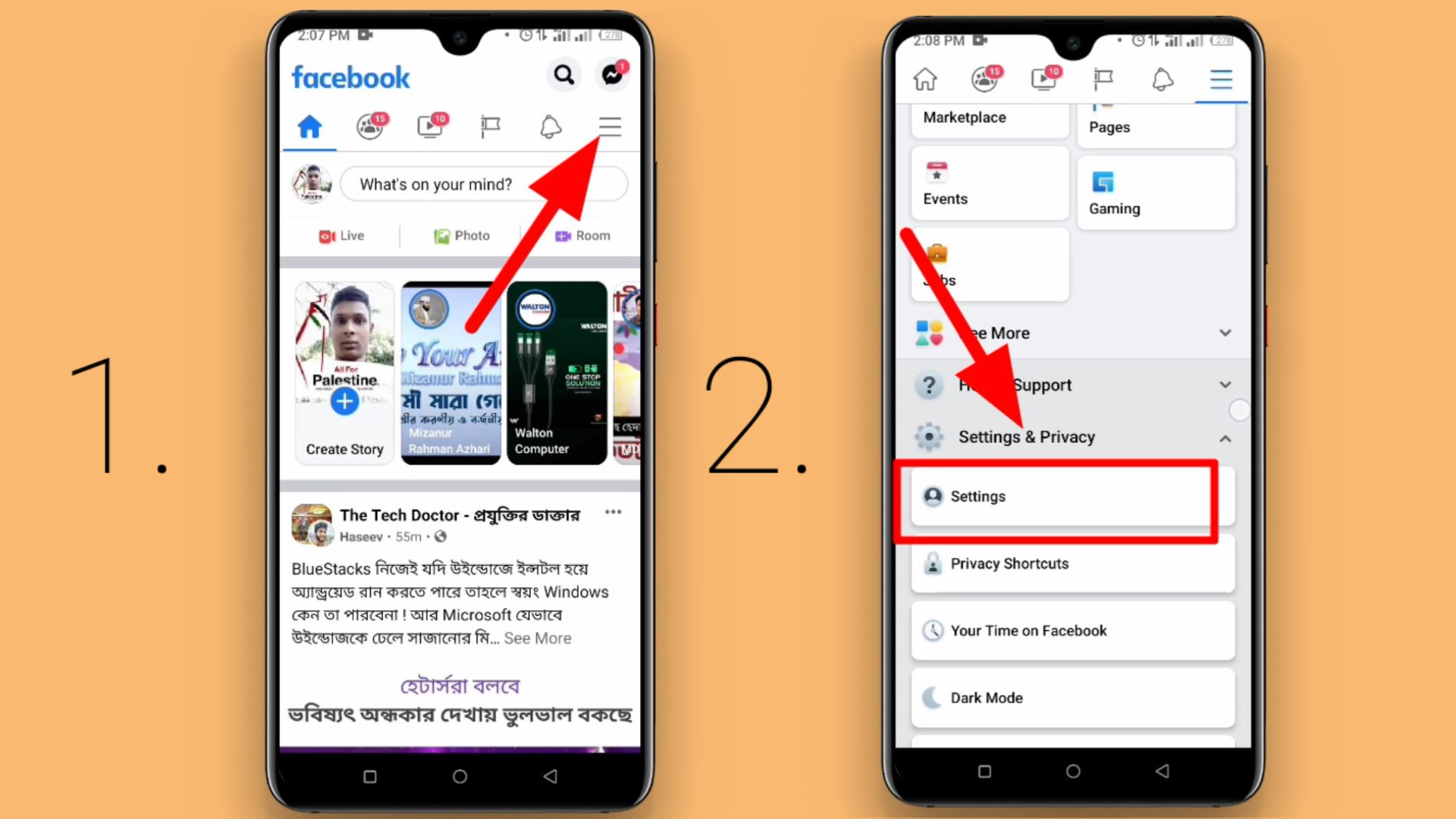 ১. এজন্য প্রথমে আপনাকে চলে যেতে হবে ফেইসবুক অফিশিয়াল অ্যাপ্লিকেশন টিতে এবং এখান থেকে আপনাকে সেটিং এ চলে যেতে হবে। ফেসবুক সেটিং এ প্রবেশ করার জন্য অ্যাপ এর উপরের মেন্যু বারে ক্লিক করবেন; যেমনটি আপনি নিচের প্রথম চিত্রে দেখতে পাচ্ছেন। এরপর আপনাকে চলে যেতে হবে Setting & Privacy অপশন থেকে Setting-এ।