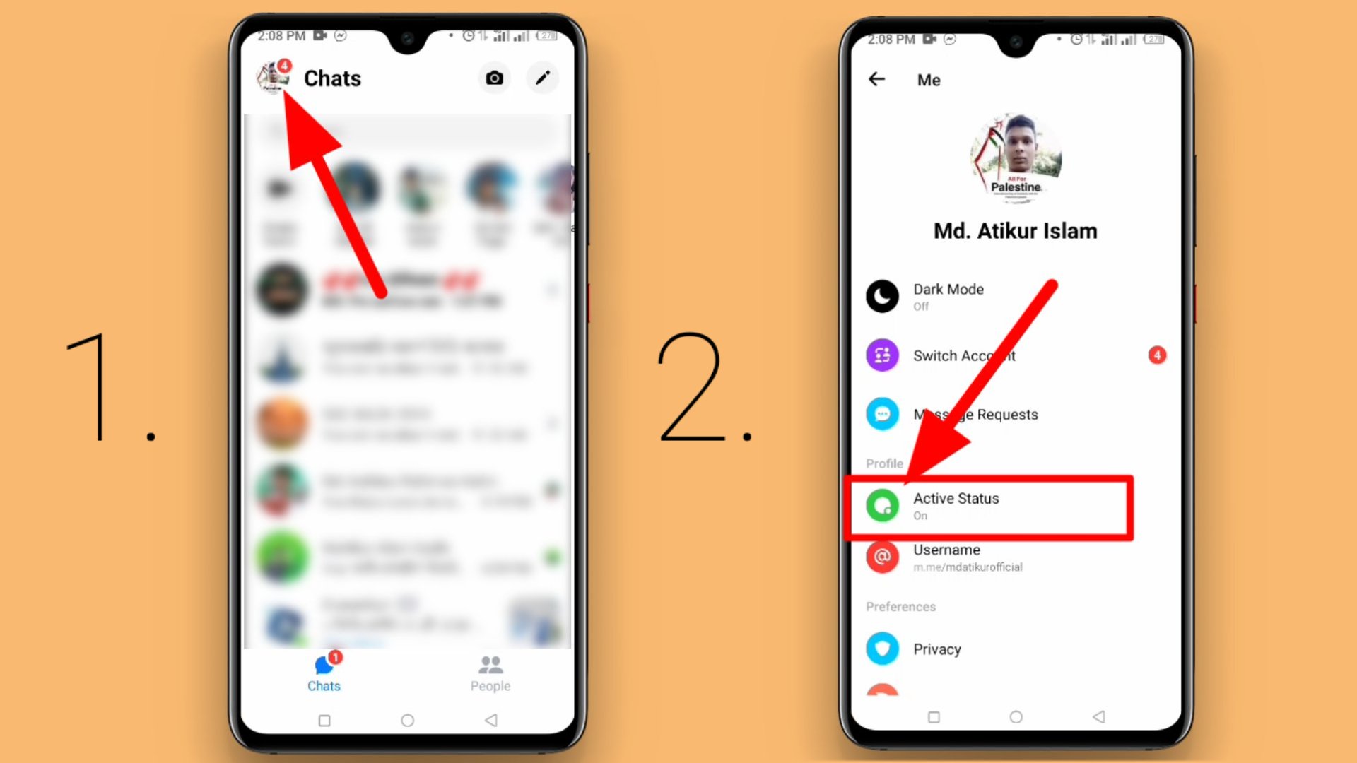 ১. এজন্য আপনাকে প্রথমে চলে যেতে হবে আপনার মোবাইলের ফেসবুক ম্যাসেঞ্জার অ্যাপটিতে। মেসেঞ্জার অ্যাপ্লিকেশন টিতে উপরের প্রোফাইল আইকনটিতে ক্লিক করতে হবে। এর পরবর্তীতে আপনি দেখতে পাবেন Active status নামের একটি সেটিং; যেমনভাবে আপনি নিচের দ্বিতীয় চিত্রে দেখতে পাচ্ছেন। তো, এবার আপনি এখানে ক্লিক করবেন।