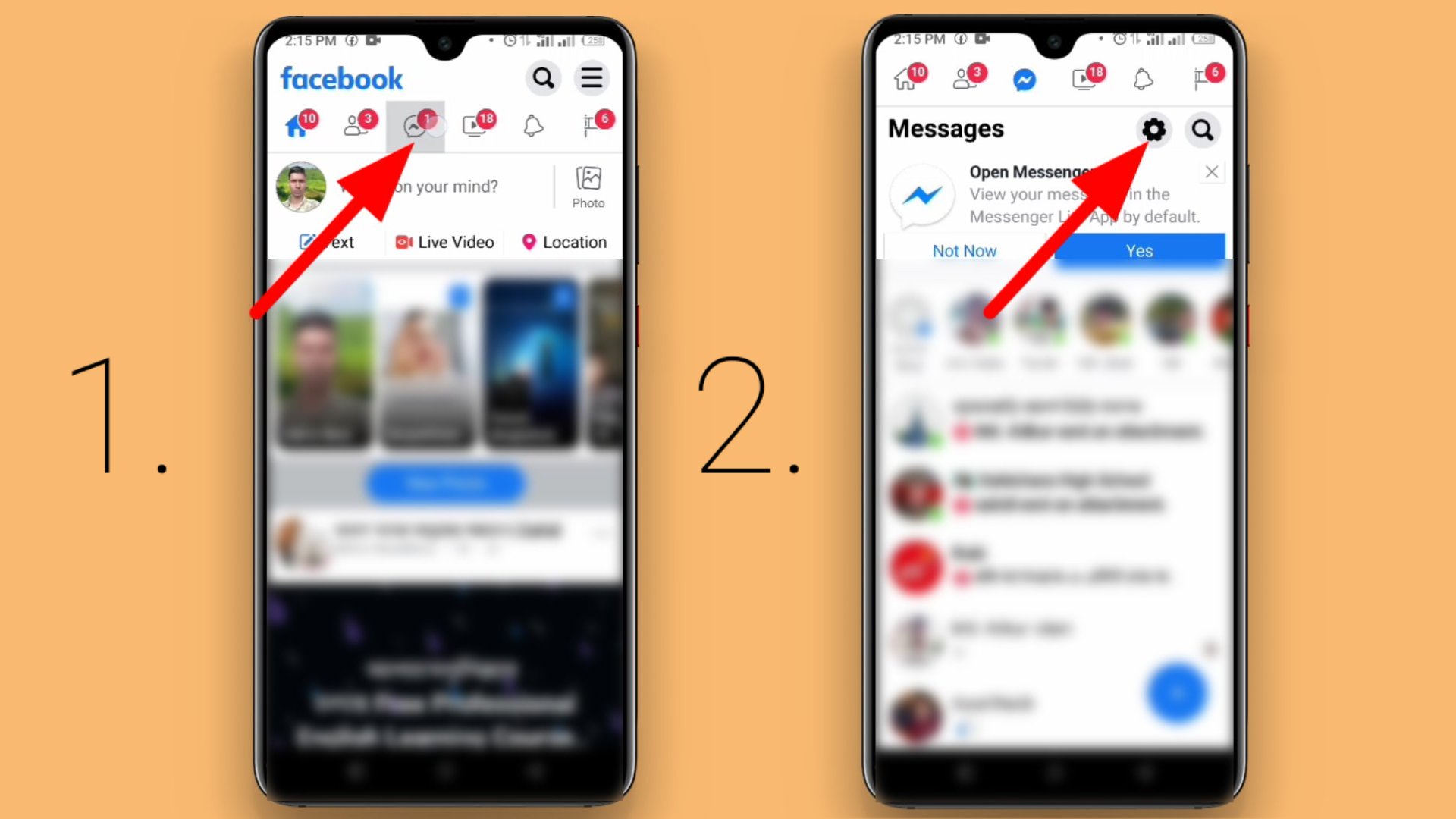 ১. এজন্য প্রথমে আপনাকে চলে যেতে হবে Facebook lite অ্যাপটিতে। তারপর অ্যাপের উপর থেকে মেসেজ আইকনটিতে ক্লিক করতে হবে; যেমনটি আপনি নিচের প্রথম চিত্রে দেখতে পাচ্ছেন। এর পরবর্তীতে নিচের দ্বিতীয় চিত্রের মত সেটিং আইকনটিতে ক্লিক করতে হবে।
