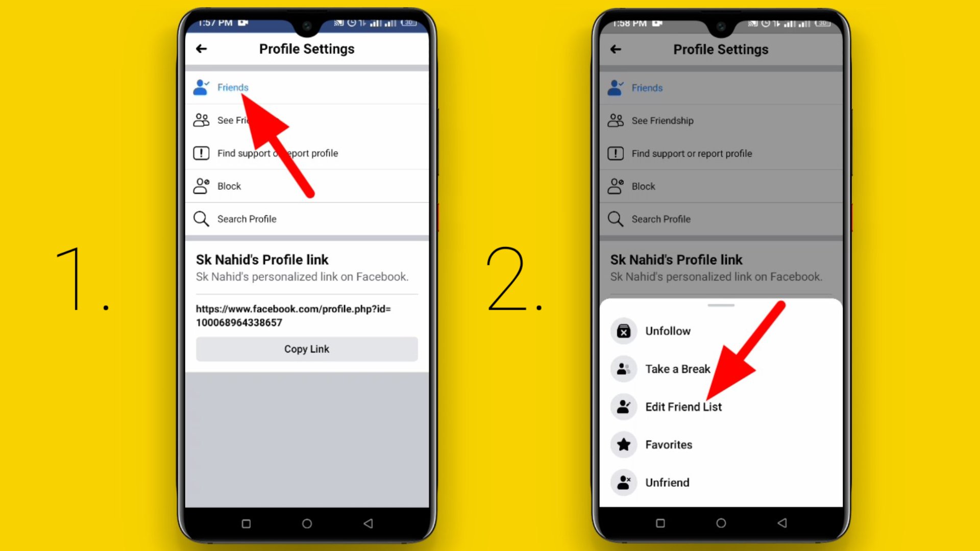 ৩. এরপর নিচে দেখানো প্রথম চিত্রের মত Friends লেখাতে ক্লিক করবেন এবং তারপর আপনার সামনে নিচের দ্বিতীয় চিত্রের মত একটি পেজ ভেসে উঠবে। এবার আপনি এখান থেকে Edit friend list অপশনটিতে ক্লিক করবেন; যেমনটি নিচের দ্বিতীয় চিত্রে তীর চিহ্নের মাধ্যমে দেখানো হয়েছে।