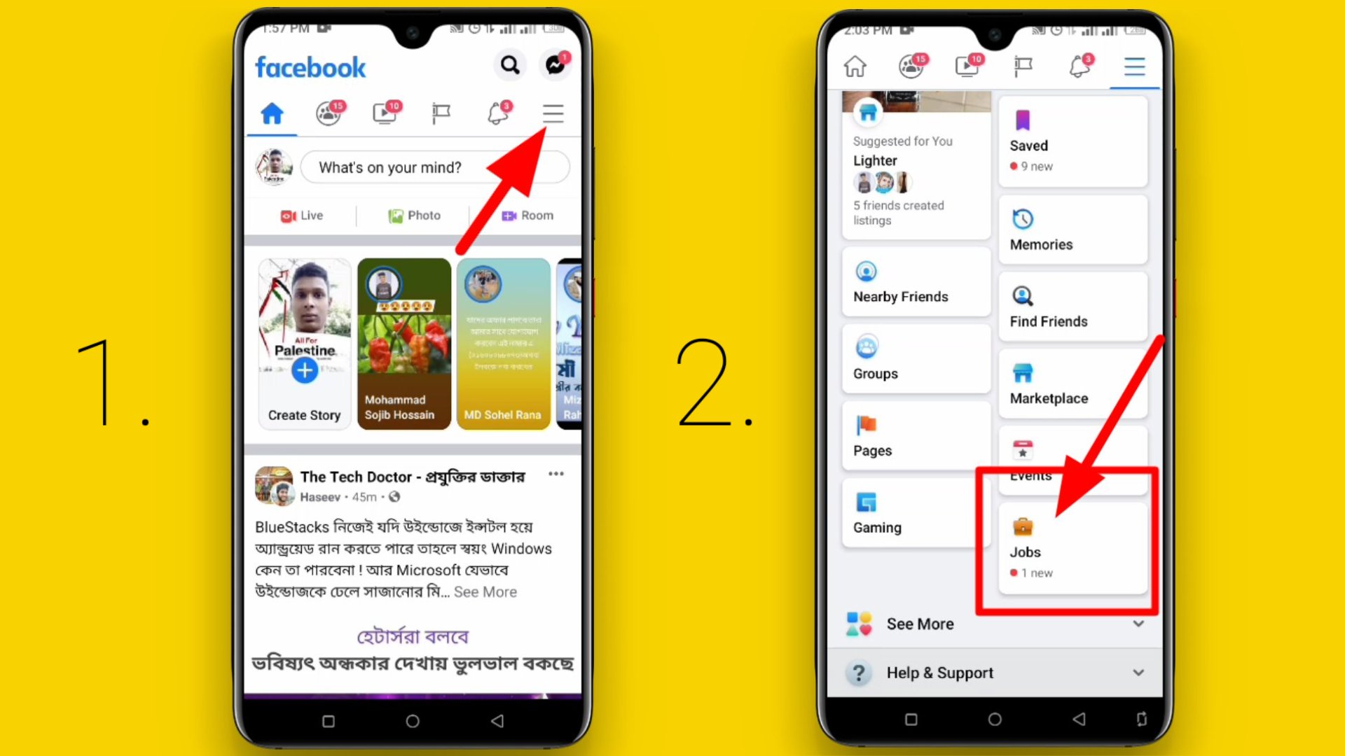 ১. এজন্য প্রথমে আপনাকে চলে আসতে হবে ফেসবুকের অফিশিয়াল অ্যাপ্লিকেশন টিতে। এবার অ্যাপে চলে আসার পর উপরের মেন্যু বারে ক্লিক করতে হবে। এর পরবর্তী পেজে আপনি নিচের দ্বিতীয় চিত্রের মত Jobs নামের ক্যাটাগরি পাবেন। এবার আপনার পছন্দমত চাকরি অনুসন্ধান করার জন্য এখানে ক্লিক করবেন।