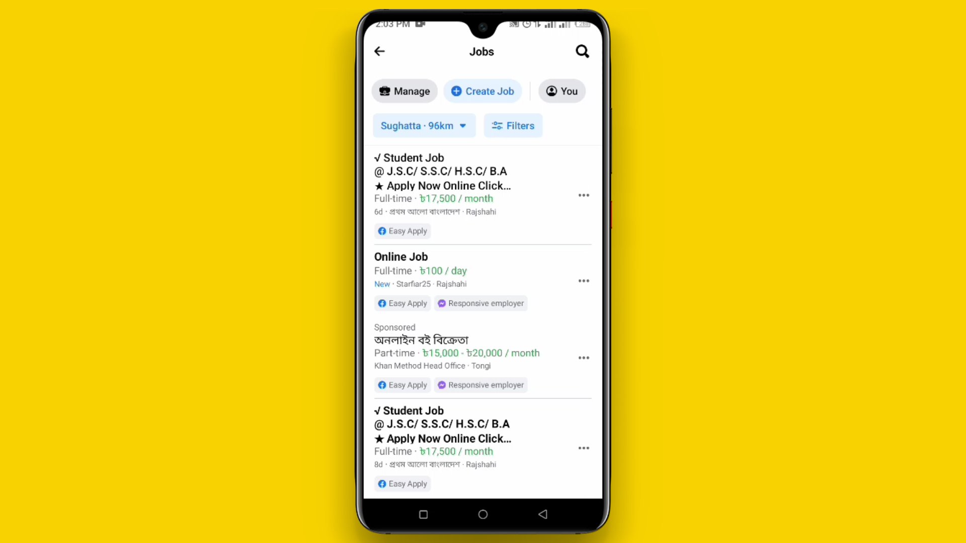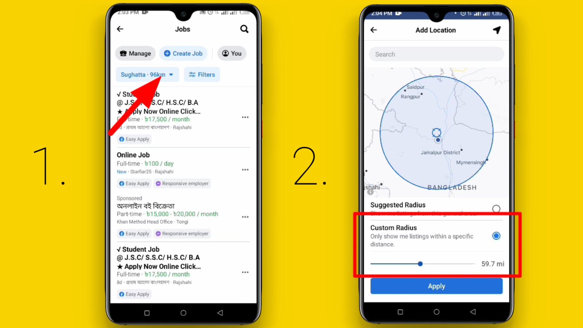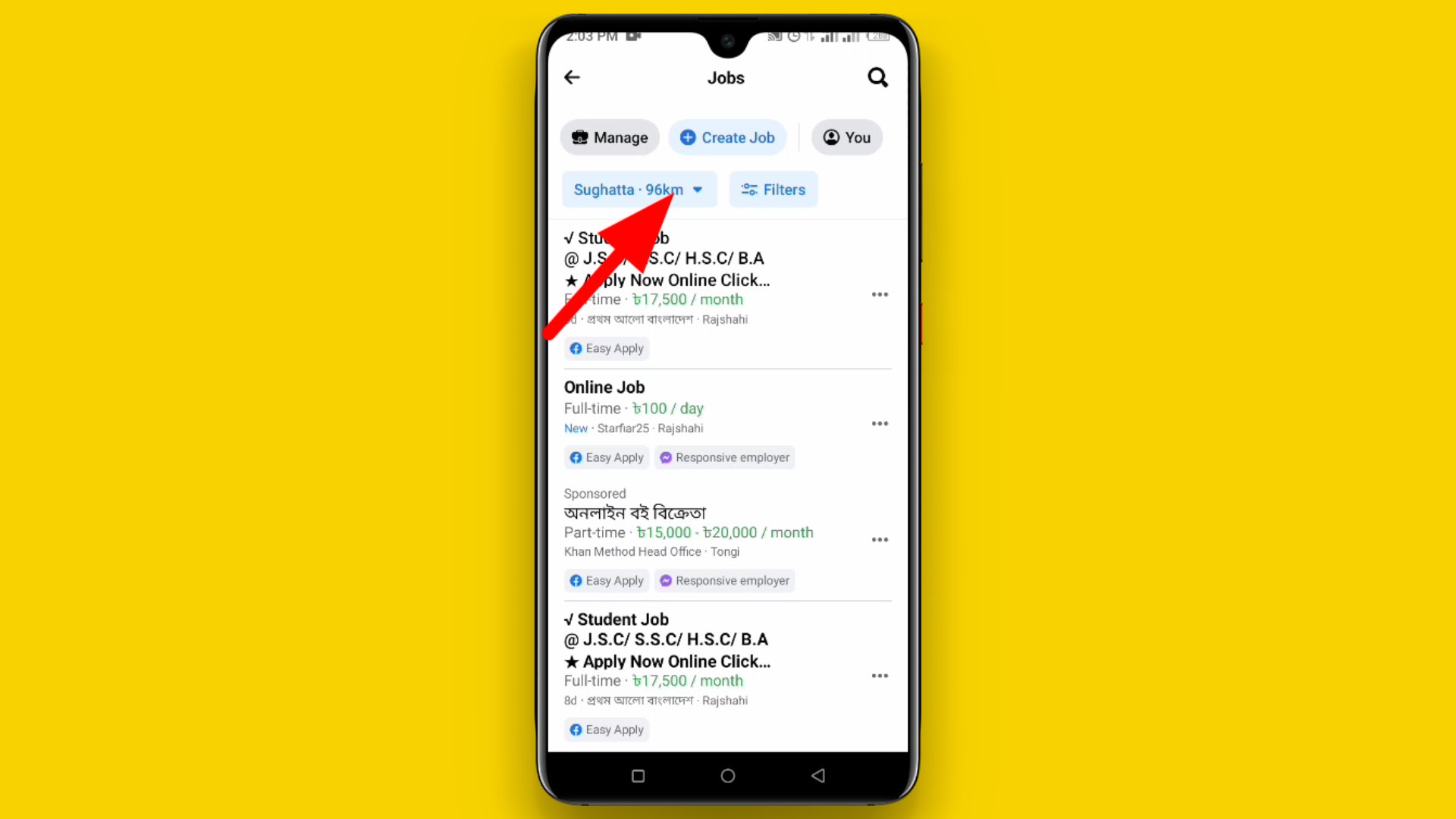 এখান থেকে লোকেশন সিলেক্ট করে দেওয়ার মাধ্যমে আপনি আপনার পছন্দের অবস্থানের চাকরিগুলো বাছাই করতে পারেন। তবে এখানে লোকেশন সিলেক্ট করার মাধ্যমে আপনি যে একেবারে সঠিক লোকেশন এর চাকরি গুলো খুঁজে পাবেন তা নয়। বরং যারা ফেসবুকে এ ধরনের চাকরির বিজ্ঞপ্তি দিয়েছিল, তারা আপনার লোকেশন এর পাশাপাশি আশেপাশের আরো বিভিন্ন জায়গা মার্ক করে সেই বিজ্ঞাপনটি দিয়েছিল। এক্ষেত্রে তারা হয়তো বা আপনাকে সেই লেখায় চাকরি দিবে না, বরং তারা সেই এলাকা থেকে মানুষ নিতে চেয়েছিল। আর এজন্য তারা সমগ্র বাংলাদেশকে মার্ক করতে পারে।
