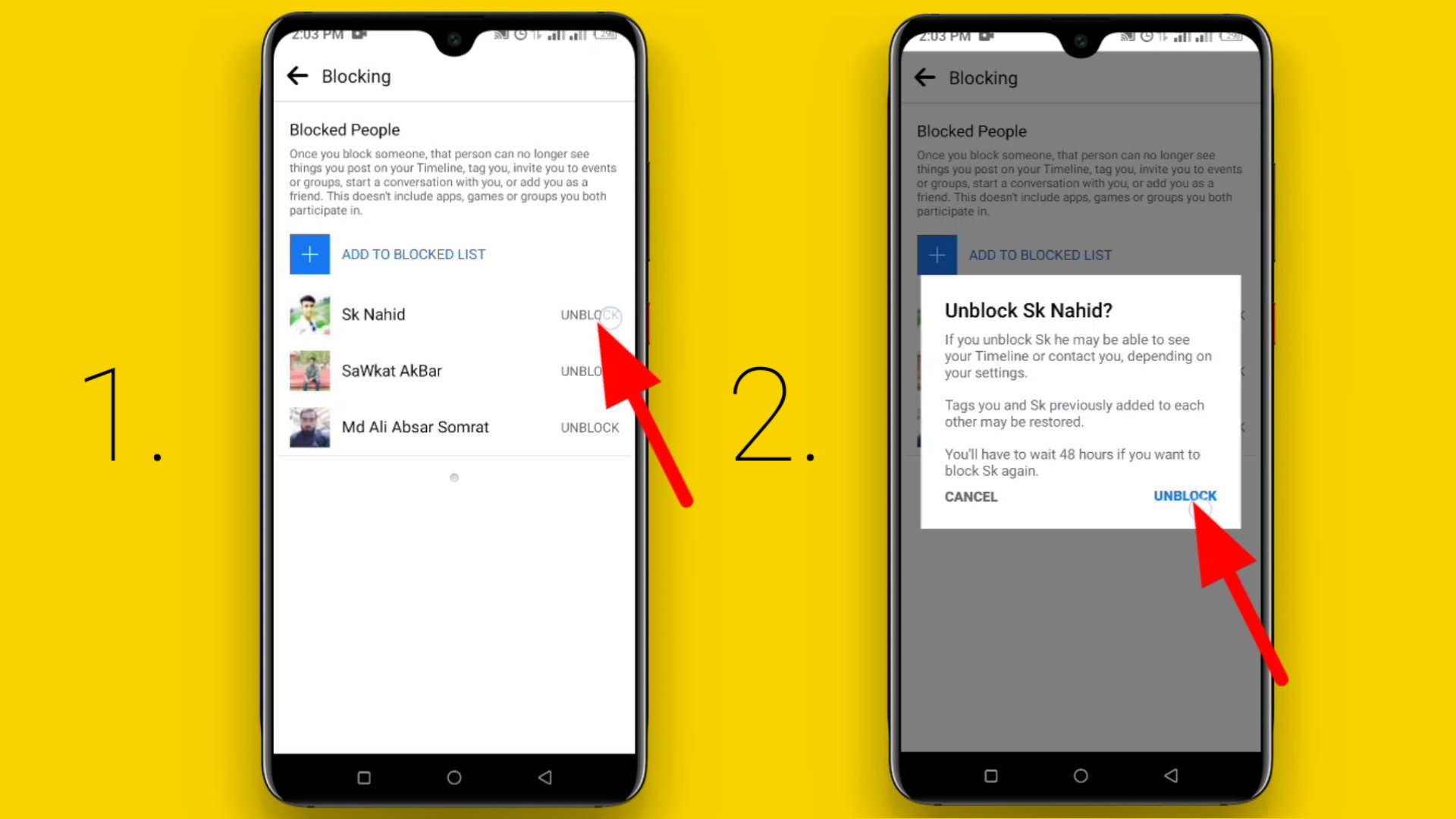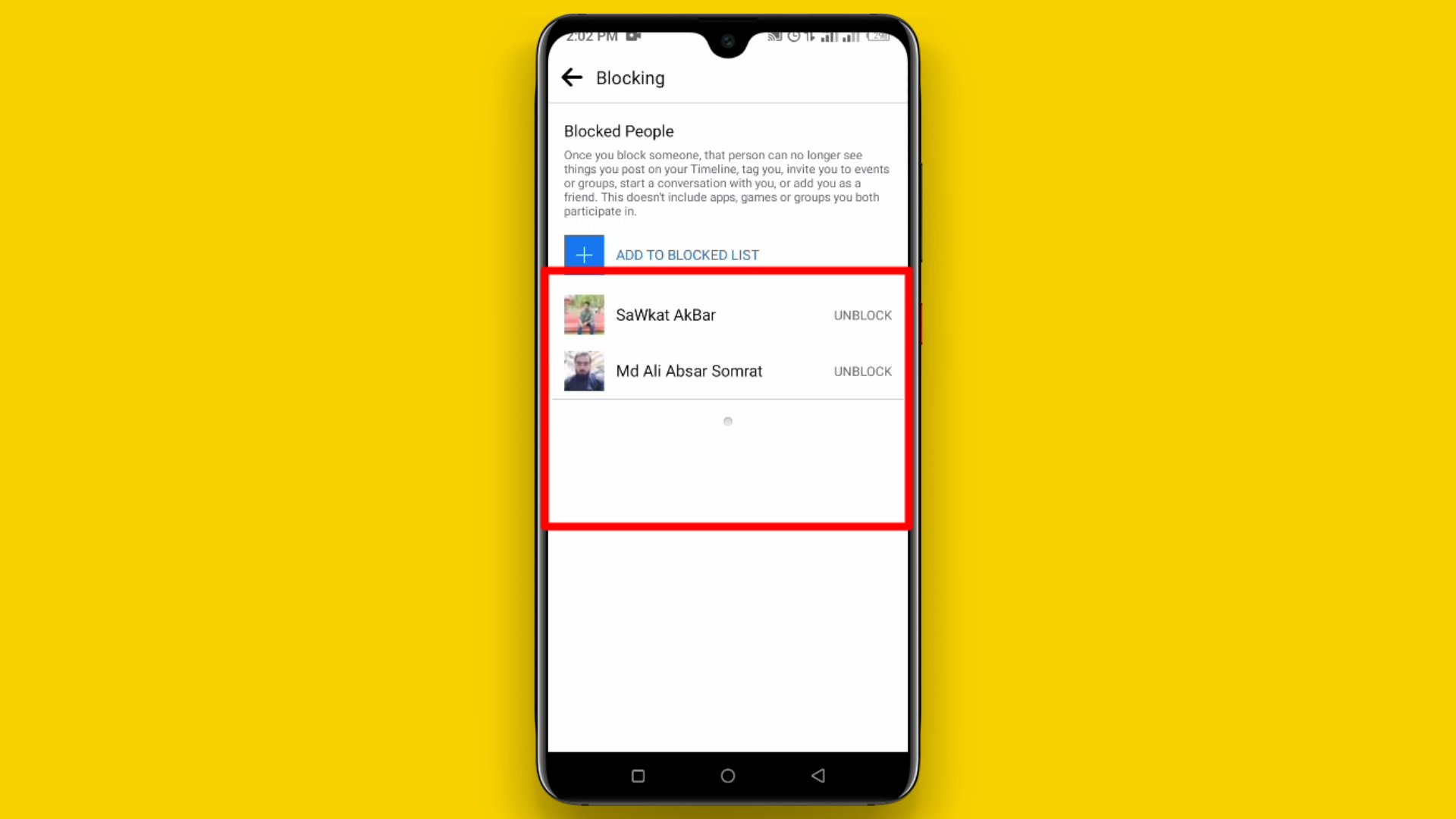 ১. এজন্য আপনাকে আবার একই সেটিং এ আসতে হবে। একই সাথে এখানে আপনি চলে আসলি ইতিমধ্যের সমস্ত বন্ধুকে ব্লক করার তালিকা দেখতে পাবেন। এইবার আপনি এখান থেকে যেই বন্ধুকে আবার আনব্লক করতে চাচ্ছেন, সেটি আপনি করতে পারবেন।