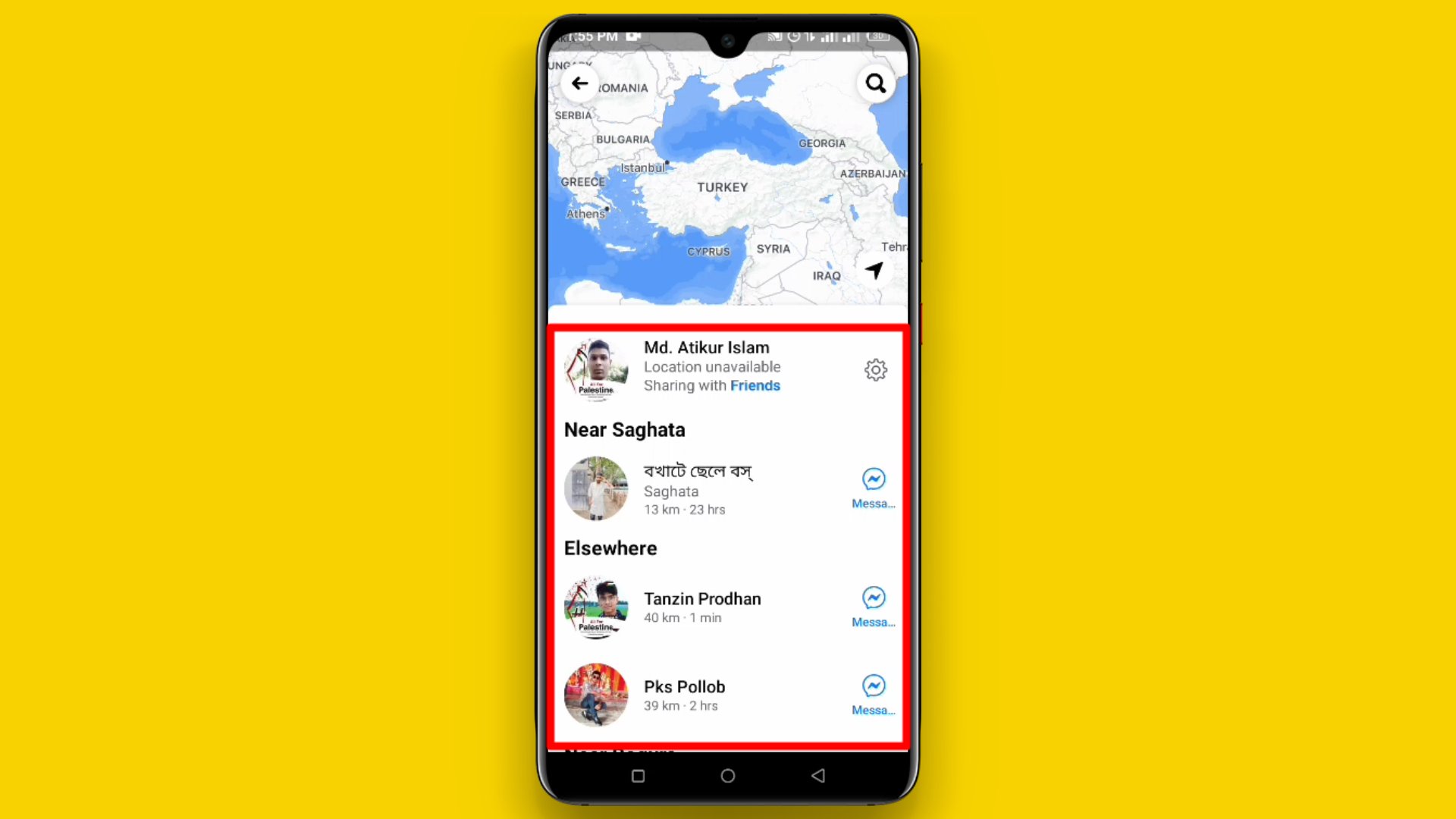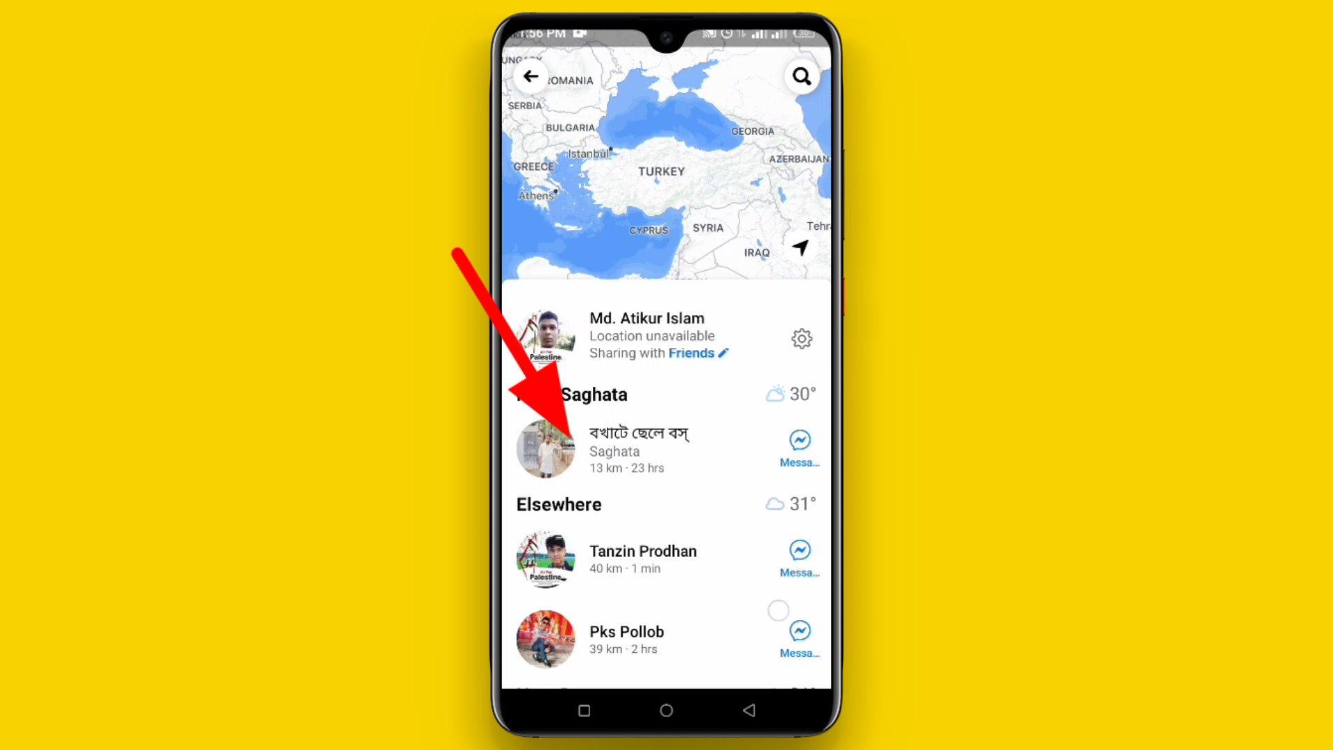 ৪. এবার আপনি এখানে দেখতে পাবেন আপনার বর্তমান অবস্থান থেকে কিছুটা দূরে যে সব বন্ধুদের বাড়ি রয়েছে বা আপনার বন্ধুদের অবস্থান রয়েছে সেগুলো পর্যায়ক্রমে এখানে রয়েছে। আপনি বর্তমানে যে অবস্থানে রয়েছেন, সেখান থেকে যে সবচাইতে কাছে রয়েছে তাকে প্রথমে দেখাবে এবং যে কিছুটা দূরে রয়েছে সে তারপরের ধাপে থাকবে।