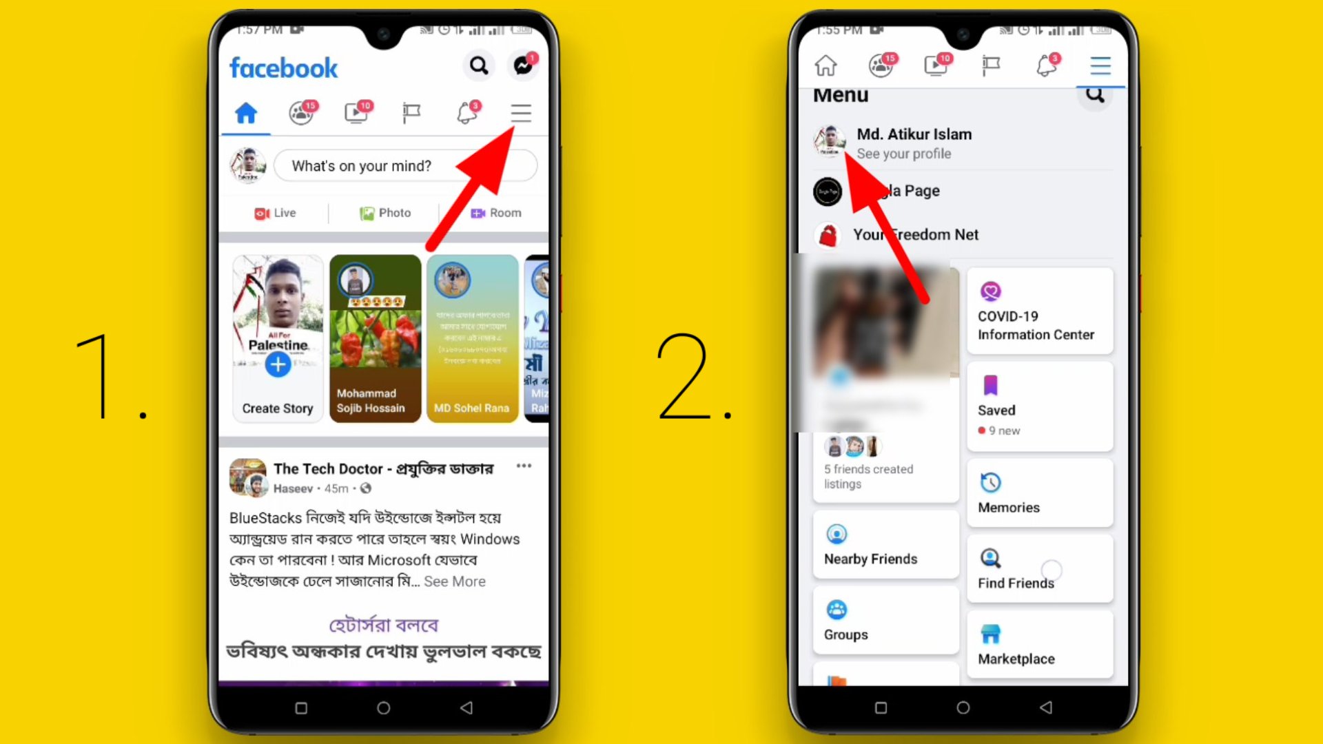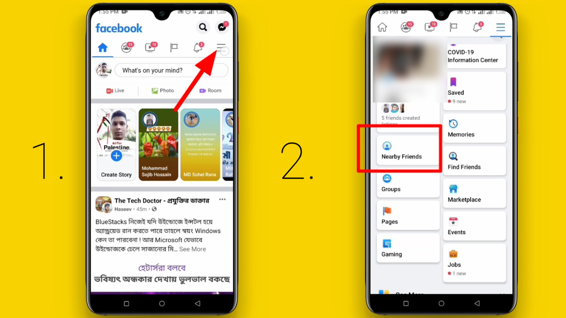 ১. এজন্য আপনাকে প্রথমে যেতে হবে ফেসবুক অ্যাপ এ। এবার এখান থেকে উপরের মেন্যু বারে ক্লিক করতে হবে; যেমনটি আপনি নিচের প্রথম চিত্রে দেখতে পাচ্ছেন। এবার এখানে ক্লিক করার পর প্রথম পৃষ্ঠাতেই নিচের দ্বিতীয় চিত্রের মত Nearby Friends নামের একটি অপশন পেয়ে যাবেন। উল্লেখ্য যে, আপনার ক্ষেত্রে এই সেটিং টি একই পৃষ্ঠার ভিন্ন ভিন্ন জায়গায় ও থাকতে পারে। তো, আপনি এবার এখানটাতে ক্লিক করবেন।