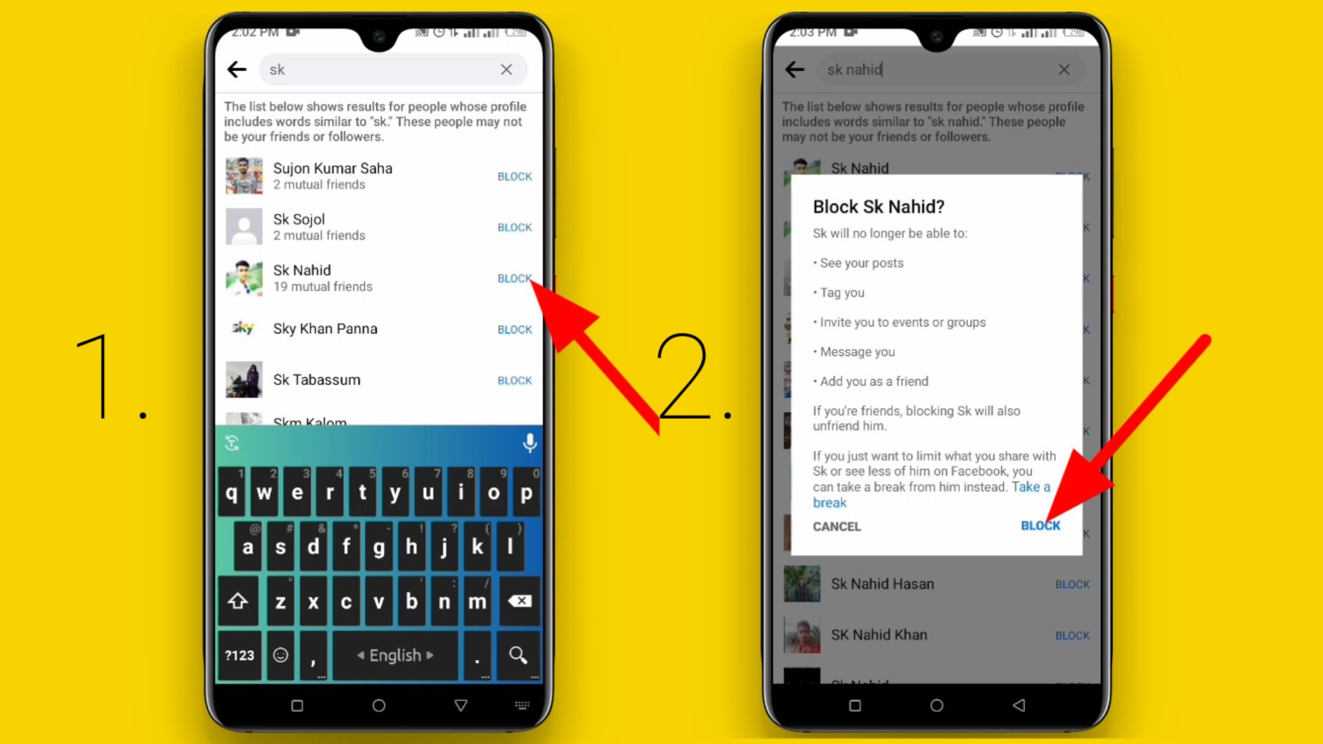 ৫. এবার আপনি উপরে একটি সার্চ বার দেখতে পাবেন, যেখানে আপনি সেই বন্ধু টির নাম লিখে সার্চ করবেন। এখানে কোন একজন বন্ধুর নাম লিখে সার্চ করার পর, তাদের নামের সঙ্গে মিল রেখে প্রোফাইল গুলো চলে আসবে। এবার আপনি এখান থেকে যে বন্ধুকে ব্লক করতে চাচ্ছেন, তার নামের বা তার প্রোফাইলের ডান পাশে Block লেখা দেখতে পাবেন। এবার আপনাকে সেই বন্ধুকে ব্লক করার জন্য এখানে ক্লিক করতে হবে এবং তারপর Block লেখাতে ক্লিক করে নিশ্চিত করতে হবে।
