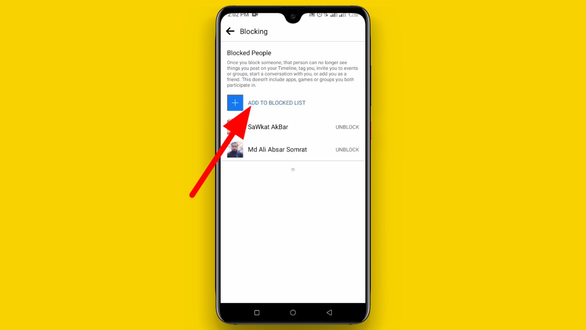 ৪. এবার এখান থেকে নতুন কোন বন্ধুকে ব্লক করার জন্য উপরের প্লাস আইকনটিতে ক্লিক করবেন। এছাড়া আপনি এখানে লেখা দেখতে পাচ্ছেন, Add to block list নামে। তবে আপনি কোন একজন বন্ধুকে এখান থেকে ব্লক না করে বরং সেই বন্ধুর প্রোফাইল থেকেও সরাসরি ব্লক করতে পারেন। যাই হোক, আপনি কোনো একজন বন্ধুকে নতুন করে ব্লক করার জন্য এখানটাতে ক্লিক করবেন।
