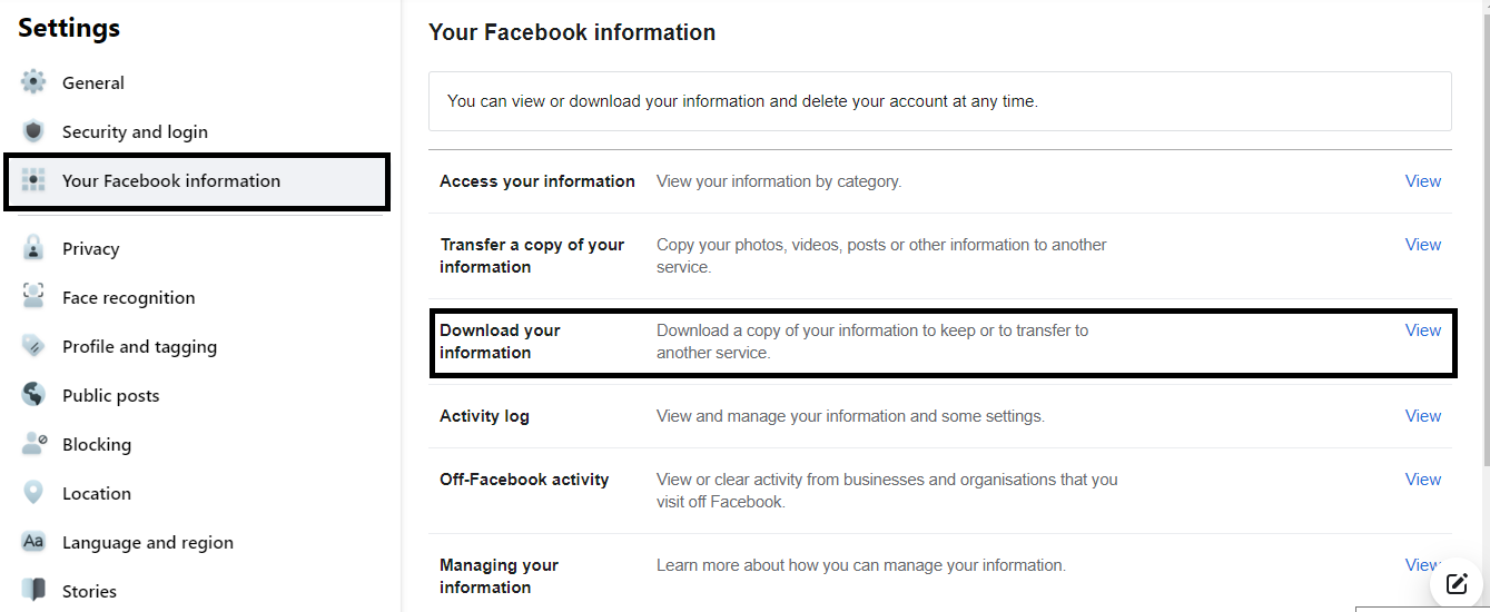 এখানে প্রথমে Your Facebook Information এ ক্লিক করুন। তারপর Download your information অপশনে ক্লিক করুন। যারা মোবাইল থেকে কাজটা করতেছেন তাদের জন্য বলে রাখি আপনার সেটিংস এ যাওয়ার পরে সরাসরি Download your information এই অপসনটা পাবেন। সেখানে ক্লিক করে পরের অংশটা চালিয়ে যান।