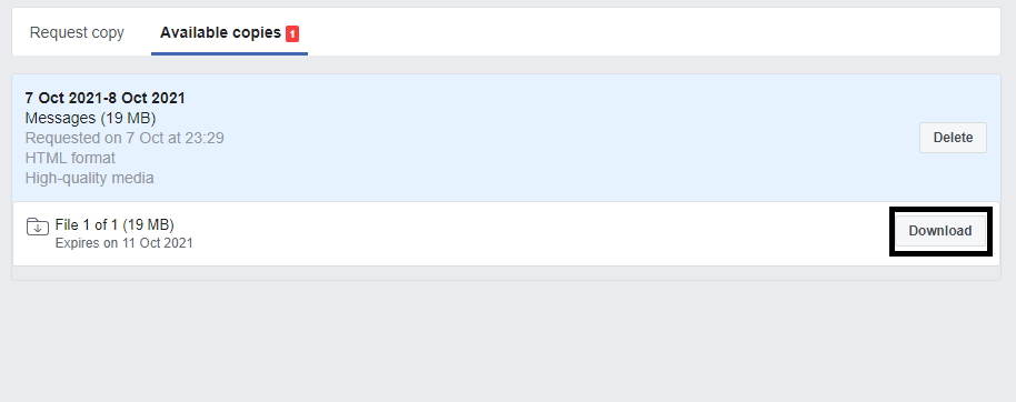 কিছুটা নিচে আসলে Request Copy নাম এ একটি অংশ দেখতে পাবেন। সেখানে প্রথমে লেখা আছে Date range। এই লেখার নিচে থাকা বক্সে ক্লিক করুন। তারপর সামনে একটি ক্যালেন্ডার ওপেন হবে এখানে আপনাকে বলে দিতে হবে কত তারিখ থেকে কত তারিখ পর্যন্ত মেসেজ এর রিকভারি করতে চান। সেটি সঠিক ভাবে সিলেক্ট করে update বাটনে ক্লিক করুন। বাকি সেটিং গুলো যেভাবে আছে সেভাবে থাকবে। আরেকটু নিচে আসলে আপনি অনেক অপসন দেখতে পাবেন যেগুলোর তথ্য আপনি ডাউনলোড করতে পারবেন। আমাদের যেহেতু এত গুলোর দরকার নাই তাই Deselect all বাটনে ক্লিক করবো। তারপর Messages অপশনের পাশে থাকা বক্সে ঠিক দিবো। সব কিছু ঠিক থাকলে উপরে থাকা Create File বাটনে ক্লিক করুন।