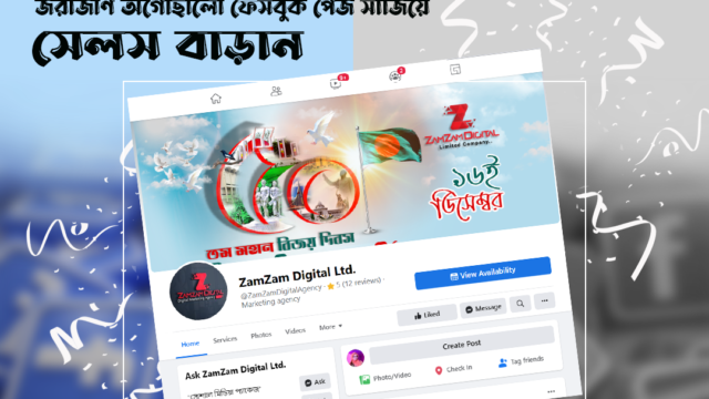 আপনাদের আস্থার শীর্ষে থাকা Zamzam Digital Ltd. এর দক্ষ ডিজিটাল মার্কেটার, গ্রাফিক ডিজাইনার দ্বারা সফলতার সাথে সেলস ওরিয়েন্টেড ডিজিটাল মার্কেটিং সার্ভিস দিয়ে আসছে, যা আপনার ফেসবুক পেজ সাজানোর পাশাপাশি সেলস বাড়াতে অত্যন্ত কার্যকর।