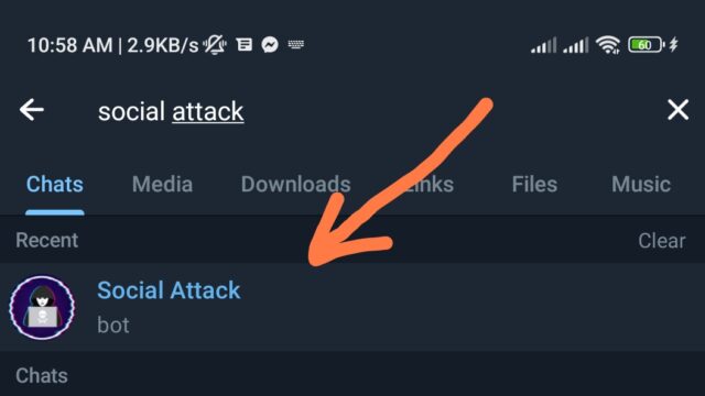 এবার আপনার সার্চ অপশনে ঠিক আমার মতো করেই লিখুন Social Attack তারপর আমার দেখানো নিচের বট টাতে ক্লিক করে বট টি ওপেন করুন।