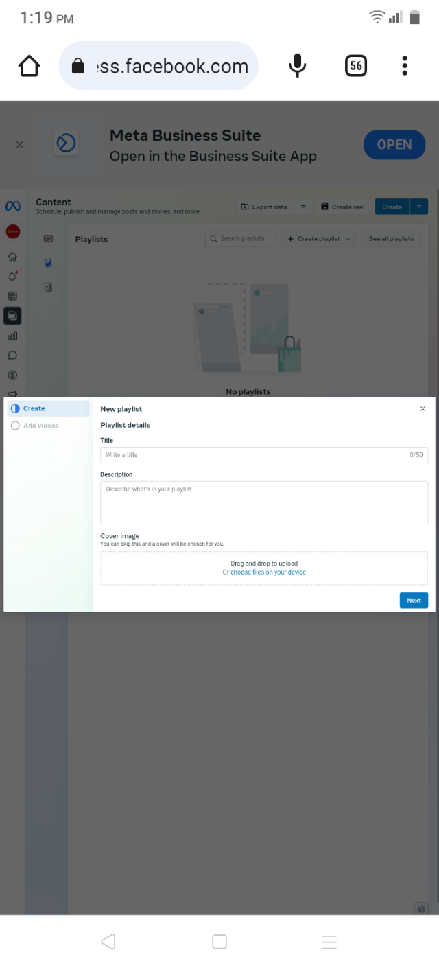 ৫. ক্লিক করার পর টাইটেল এবং ডেসক্রিপশন নামে খালি জায়গা থাকবে। সেখানে আপনার ভিডিও অথবা রিলসের টাইটেল এবং নিচে ডেসক্রিপশন দিয়ে দিবেন। দিয়ে দেওয়ার পরে নিচে দেখতে পারবেন কবার ইমেজ নামে একটি অপশন আছে। সেখানে আপনি চাইলে একটি কভার ইমেজ দিয়ে দিতে পারেন। এটা পুরোটাই অপশনাল। তবে দিলে ভালো দেখায়। এখন নেক্সট অপশনে ক্লিক করলে আপনার প্লে লিস্টি তৈরি হয়ে যাবে।