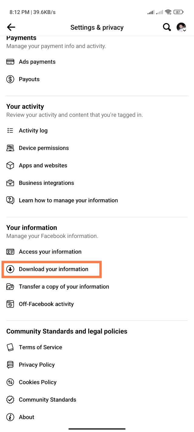 ৬. এবার আপনারা স্ক্রোল করে একদম নিচে আসবেন। নিচে আসার পর Download Your Information অপশনে ক্লিক করুন।
