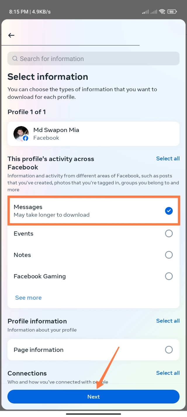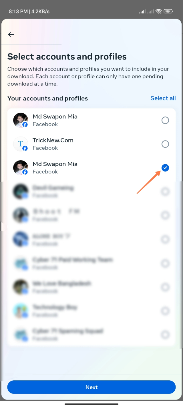 ৯. তারপর আপনাদের ফেসবুক অ্যাকাউন্ট এর সাথে যুক্ত থাকা সকল অ্যাকাউন্ট এর লিস্ট দেখতে পারবেন। সেগুলো সবগুলোতে টিক-মার্ক দেওয়া থাকবে। আপনাদের যেগুলোর দরকার নাই সেগুলো থেকে টিক মার্ক রিমুভ করে দিবেন। আর যে অ্যাকাউন্ট থেকে মেসেজ রিকভার করতে চাচ্ছেন সেই অ্যাকাউন্টে ব্লু টিক মার্ক দিয়ে রাখবেন এবং Next এ ক্লিক করবেন।