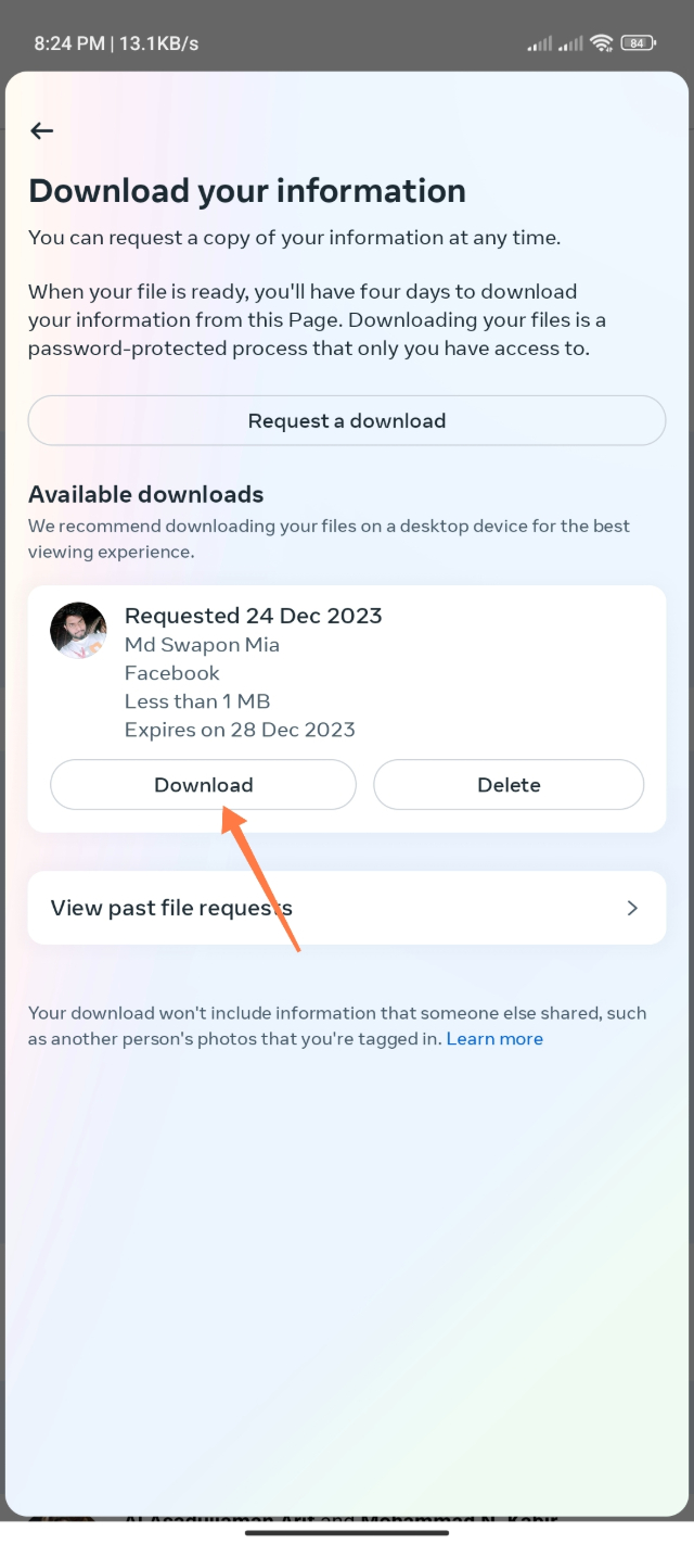 ৮. এবার আপনাদের ইনফরমেশনগুলো ডাউনলোড করার জন্য ফেসবুকের কাছে রিকোয়েস্ট করতে হবে৷ যাতে ফেসবুক আপনার চাহিদা অনুযায়ী সকল ডকুমেন্টস তৈরি করতে পারে। তো এর জন্য আপনারা আবারো Request A Download অপশনে ক্লিক করবেন।