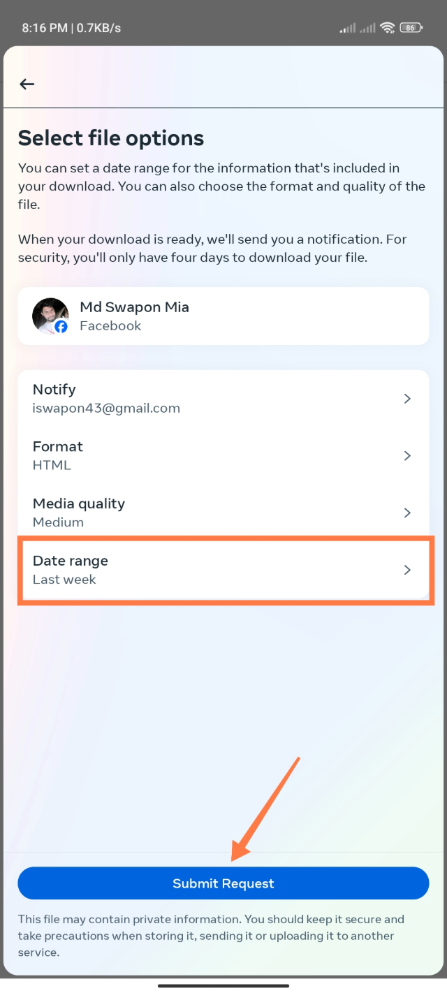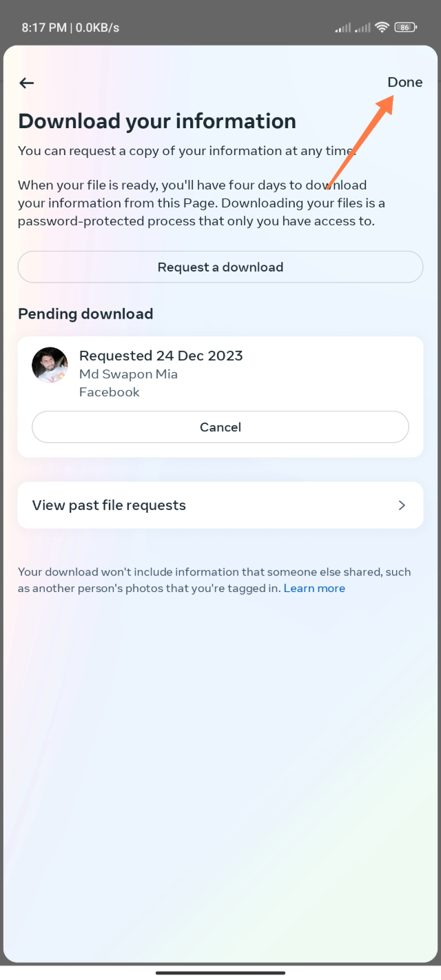 এবার আপনারা কিছুক্ষণ অপেক্ষা করুন। আপনার রিকোয়েস্ট করা ফেসবুকের সমস্ত মেসেজগুলো ডাউনলোড করার জন্য ফেসবুক তা HTML ফাইল আকারে রেডি করবে। ফেসবুকের কাজগুলো সম্পূর্ণভাবে করা হয়ে গেলে ফেসবুক আপনাদের নোটিফিকেশনের মাধ্যমে জানিয়ে দিবে। তখন আপনি আপনার ডিলেট হওয়া মেসেজ সহ যাবতীয় সমস্ত মেসেজগুলো ডাউনলোড করার পারমিশন পেয়ে যাবেন। সবগুলো প্রসেস কমপ্লিট ৫/১০ মিনিটের মতো লাগতে পারে৷