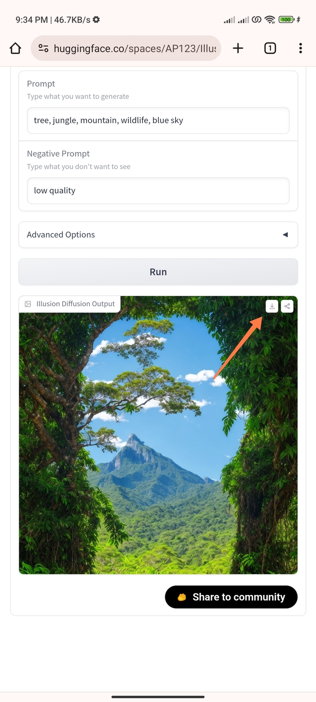 ১১. বন্ধুরা দেখুন আমাদের Huggingface Ai Tools টি আমাদের Elon Mask এর ছবিতে সুন্দর একটি ইল্যুশন ফটো তৈরি করে দিয়েছে। আপনারা ডাউনলোড আইকনে ক্লিক করে ইমেজটি স্টোরেজে সেভ করে নিতে পারবেন।