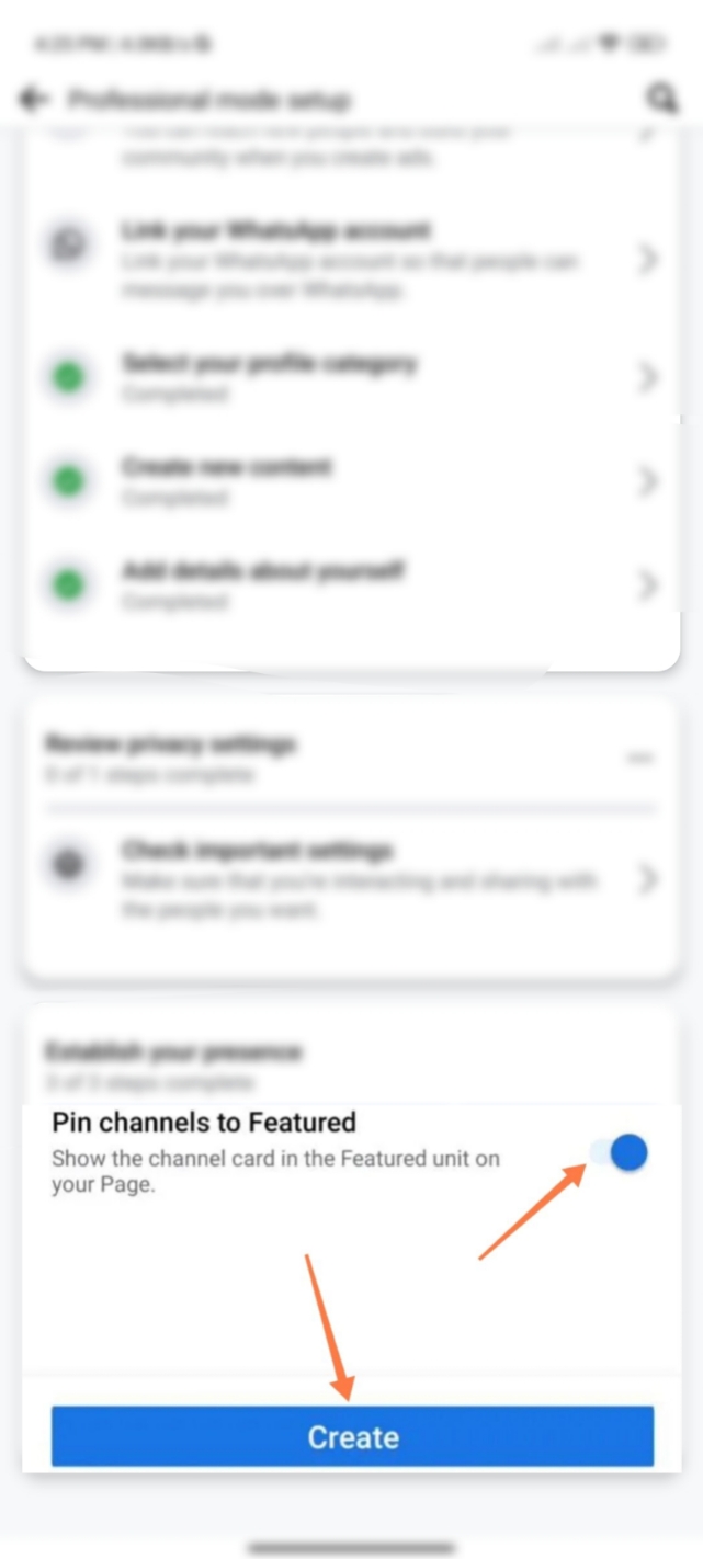 ৫. এবার আপনার Pin Channels To Feature অপশনে ক্লিক করে ব্লু টিক মার্ক করে দিন এবং নীচ থেকে Create অপশনে ক্লিক করুন।