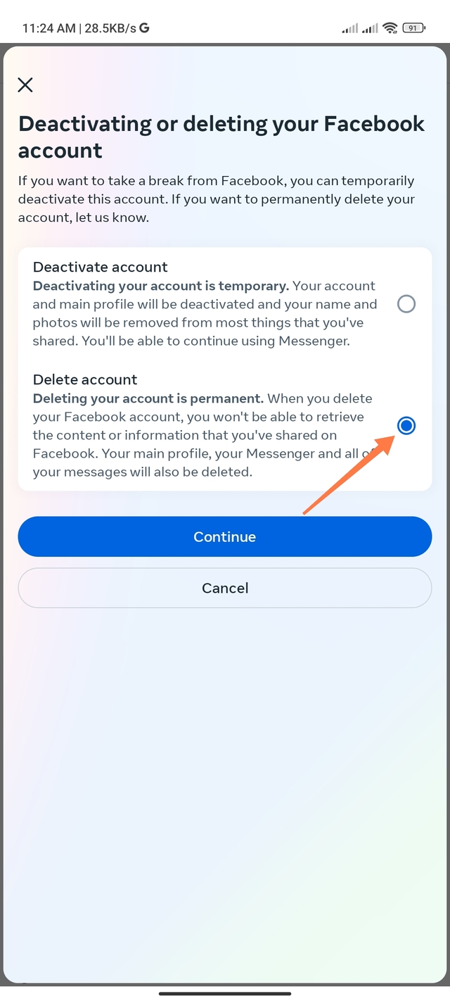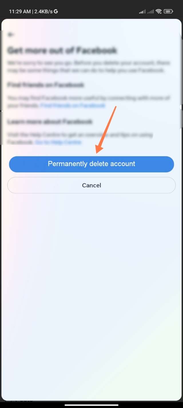 বিদ্রঃ মনে রাখবেন, একবার আপনি আপনার ফেসবুক অ্যাকাউন্ট পারমানেন্ট ডিলিট করলে আপনি আর আপনার সেই ফেসবুক অ্যাকাউন্টের কোনো অ্যাক্সেস পাবেন না। আপনি আপনার সেই ফেসবুক অ্যাকাউন্ট এর যাবতীয় সকল ডকুমেন্টস হারিয়ে ফেলবেন। মনে রাখবেন, ডিলিটকৃত অ্যাকাউন্ট পুনরুদ্ধার করা সম্ভব নয়, তাই সাবধানে নির্বাচন করুন।