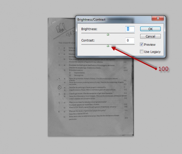 4. এবার Image>Adjustment> Brightness/Contrast এ ক্লিক করে কন্ট্রাস্ট অ্যাডজাস্ট করুন। কন্ট্রাস্ট 100 দেবেন ব্রাইটনেস ইচ্ছে মত। এই ধাপটি আপনাকে ৫-৬ বার করতে হবে।