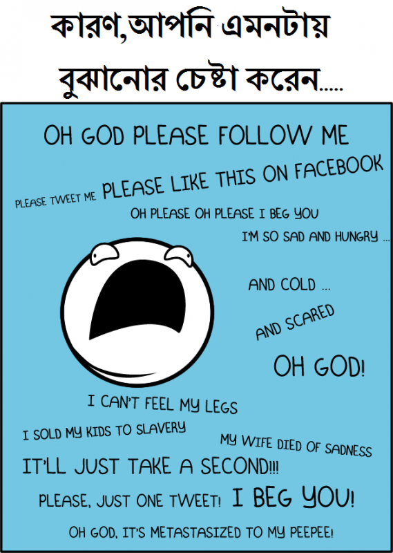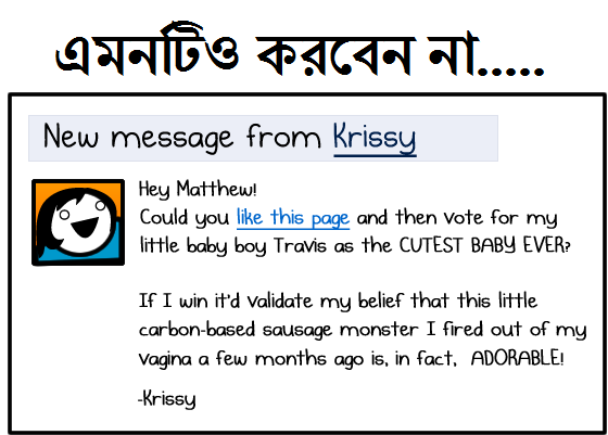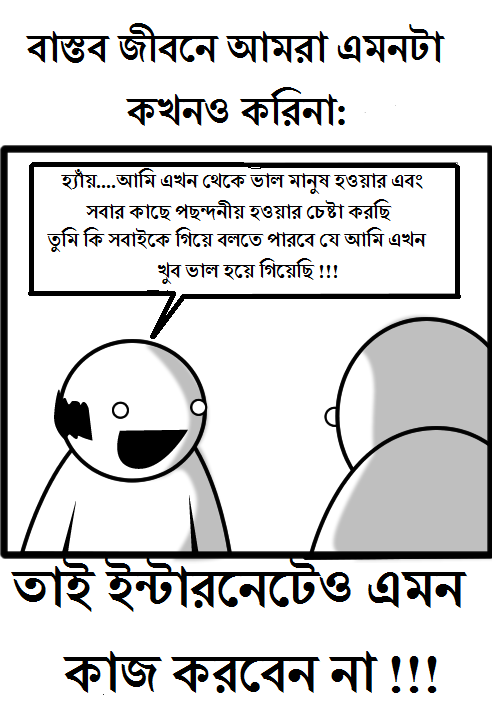অনেকের প্রশ্ন হতে পারে এতো নিষেদাজ্ঞা দিলে তো আর ফেবু ইউস করতে হবেনা,ফেবুতে গিয়ে মশা মারতে হবে !! 😡 আমি বলি না !! মনে রাখবেন আপনার ফেবু একাউন্ট এর প্রতিটা কাজ আপনার Personality কে Show করে। তাই এমন কিছু করুন যা দেখে বা পড়ে মানুষ এর ভাল লাগবে আর এমনিতেই আপনার যেকোনো post এ লাইক দিতে মন চাইবে। আমি এমন কিছু পেইজ দেখেছি যেগুলো প্রথম দিকে মানুষ এর মন জয় করতে পারেনি কিন্তু তারা হাল ছেড়ে না দিয়ে তাদের ভাল লিখাগুলো প্রতিনিয়ত টিউন করতে থাকে,যাদের পেইজে এখন হাজার হাজার লাইক শোভা পায়। 😎
