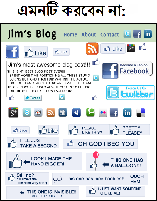 আমরা অনেকে আমাদের নিজেদের ব্লগে আমাদের নিজেদের জনপ্রিয় করতে ফেসবুক,টুইটার ইত্যাদি সামাজিক সাইট এর লাইক,ফলো বাটন এর মাত্রাতিরিক্ত ব্যবহার করি যা ব্লগ এর মাধর্য নস্ট করা সহ সেই ব্লগ এর এডমিন সম্পর্কে বিরুপ ধারনা আনে ভিসিটর দের মধ্যে।
