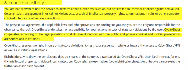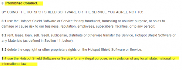 জনপ্রিয় ভিপিএন সেবাদানকারি প্রতিষ্ঠান Cyberghost এবং HotspotShield এর Terms of Service (সেবাদেয়ার শর্ত) দেখুনঃ