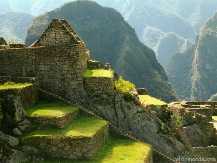 পিছনে মাথা উঁচু বিশাল পর্বত শৃঙ্গটি ওয়াইনা পিচু। ধাপে ধাপে বাঁধানো চত্বরগুলো (terraces) পাহাড়ের গায়ে এমনভাবে স্থাপিত যাতে মূল স্থাপনা ধ্বসে না পড়ে। অনেকের মতে এসব বাঁধানো চত্বরে ফসল ফলানো হত যেহেতু বিশেষ কায়দায় এসব বাঁধানো চত্বরের উপরিভাগে কৃষি উপযোগী টপ সয়েল ব্যবহৃত হয়েছে।