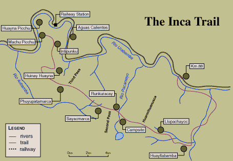 মনোরম উপত্যকা ও দুর্গম গিরির ভিতর দিয়ে চলে গেছে ইনকা ট্রেইল। আজও ধ্বংসাবশেষ দেখে চেনা যায়। মূল ২টি পথ ছিল- উত্তর-দক্ষিণে .. কোনও কোনও পথ ১৬০০০ ফুট উপরে। ৪০, ০০০ কিলোমিটার।