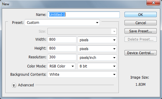 ➡ Step-1:- প্রথমে ফটোসপ ওপেন করে File>New –তে যান। এবার ৮০০X৮০০ পিক্সেল পরিমাপের একটি নতুন পেজ ওপেন করুন। ঠিক এভাবে-