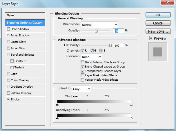 এরপর Menu থেকে Layer>Layer Style>Blending Options: -এ গিয়ে এর Opacity: 50% দিয়ে OK করে বেরিয়ে আসুন।