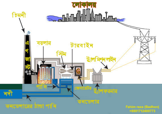 পানিকে শোধন করে সে পানি পাম্পের মাধ্যমে বয়লারে আনা হয়। এখানে ওয়াটার টিউব বয়লার ব্যবহার করা হয় বলে পানিকে টিউব মধ্যে প্রবাহিত করা হয় এবং FDF এর মাধ্যমে বাতাস এবং ফুয়েল হিসাবে মিথেন (CH4) গ্যাস বার্নারে নেওয়া হয় এবং বার্ন করা হয়, এখানে গ্যাস সাপলাই দেয় তিতাস গ্যাস। এ সময় পানি স্টিমে পরিনত হয়। এ সময় স্টমের তাপমাত্রা থাকে প্রায় ১৭০-১৭৫ ডিগ্রি সেলসিয়াস এবং চাপ থাকে প্রায় ৩০ বার এর মত। এরপর স্টিম কে বয়লার ড্রাম নেওয়া হয়। এরপর SH দিয়ে স্টিমকে প্রেরন করা হয়। SH তাপ দেওয়ার ফলে এর তাপমাত্রা প্রায় ৫২০-৫২৫ ডিগ্রি সেলসিয়াস হয়ে যায় এবং চাপ প্রায় ১৩৫-১৩৮ বার হয়ে যায়। এবার এই স্টিম কে HPT তে দেওয়া হয় এবং HPT কে ঘুরিয়ে এগজাস্ট দিয়ে যে স্টিম বের হয় তাকে RH এ নেওয়া হয়। বের হয়ার সময় স্টিমের তাপমাত্রা কমে গিয়ে প্রায় ৩৩০-৩৩২ ডিগ্রি সেলসিয়াস হয় এবং চাপ হয় ৩২ বার হয়।