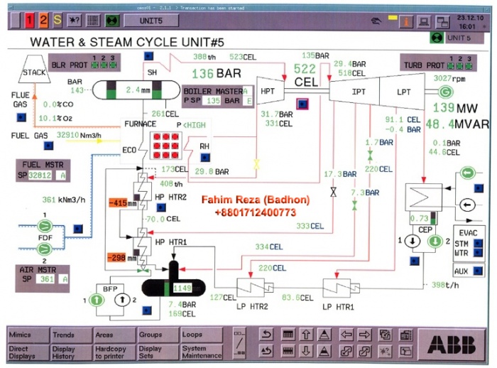 একে RH এর মাধ্যমে পুনরায় তাপ দিয়ে স্টিমের তাপমাত্রা প্রায় ৫২০-৫২৫ ডিগ্রি সেলসিয়াস হয়ে যায় এবং চাপ প্রায় ১৩৫-১৩৮ বার। এবার এই স্টিম IPT তে দেওয়া হয় এবং এরপর LPT তে দেওয়া হয়।এ সময় টারবাইন জেনারেটর কে ঘুরাতে শুরু করে। এ সময় জেনারেটর প্রায় ৩০০০ RPM ঘুরে। অর্থাৎ প্রতি মিনিটে ৩০০০ হাজার বার জেনারেটর ঘুরতেছে। এবার LPT হতে এগজাস্ট স্টিম পাইপ দিয়ে কনডেন্সার প্রবেশ করে সে সময় স্টিমের প্রায় ৪৪-৪৫ ডিগ্রি সেলসিয়াস হয়ে যায় এবং চাপ প্রায় ০.১ বার হয়। এবার একে কনডেন্সার দিয়ে নিয়ে LPH1 এবং LPH2 তে নেওয়া হয় এবং এ সময় তাপমাত্রা প্রায় ১২৫-১৩০ ডিগ্রি সেলসিয়াস হয়ে যায় এবং চাপ এখানে অনেক কম থাকে। এবার এই স্টিম কে ডিয়ড়েটর এ নেওয়া হয় এবং সেখান থেকে BFP এর মাধ্যমে HPH1 ও HPH2 হয়ে বয়লার ড্রামে যায় এবং তাকে আবার টারবাইনে প্রেনন করা হয়। নিচে আমি আশুগঞ্জ পাওয়ার স্টেশনের ইউনিট ৫ এর একটি কম্পিউটার স্কিনশর্ট দিয়ে দিলাম আশা করি এটা দেখে কিছু বুজবেন।