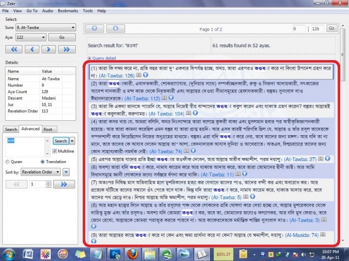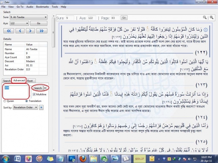 ধরুন আপনি কোরআন শরীফের “তওবা” শব্দটি কোথায় আছে জানতে চাইছেন। তাহলে বামদিকের Search বা Advanced বক্স থেকে বাংলায় টাইপ করুন তওবা তারপর Search বাটনে ক্লিক করুন।