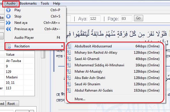 কেউ যদি অনলাইনে তেলাওয়াত শুনতে চান তবে- Audio > Recitation থেকে ক্বারীর নাম সিলেক্ট করুন (আপনার ইন্টারনেট সংযোগ কত গতির সে অনুসারে সিলেক্ট করে নেবনে)