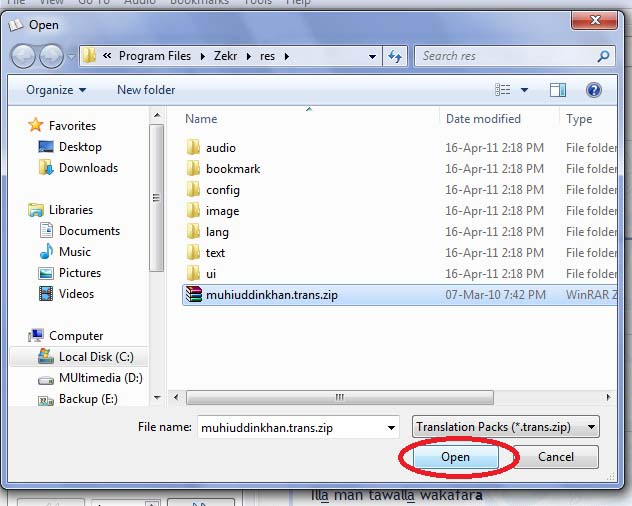৫. বাংলা অনুবাদের muhiuddinkhan.trans.zip ফাইলটি হার্ডডিস্ক থেকে সিলেক্ট করে Open এ ক্লিক করুন।