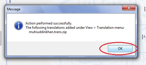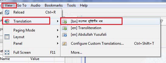 ৮. এবার View > Translation > [bn] মাওলানা মুহিউদ্দীন খান এ ক্লিক করুন। বাংলা আসবে।