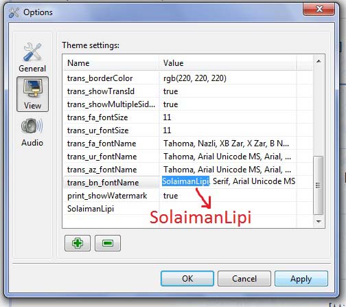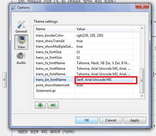 ১০. trans_bn_fontName এর ঘরে SolaimanLipi টাইপ করুন, তারপর একটি কমা (, ) দিন যেমন স্ক্রিণশটে দেখানো হয়েছে। Apply করে OK করুন। পেয়ে গেলেন ক্রিস্টাল বাংলা!
