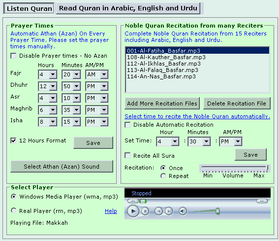 পাঁচটি সূরা এর সাথেই আছে, আপনি ইচ্ছে করলে সূরা বক্স এর উপরের লিংক এ ক্লিক কোরে সকল সূরা যোগ করতে পারেন অথবা Add More Recitation Files এ ক্লিক কোরে Add from my computer নির্বাচন কোরে আপনার কম্পিউটার থেকেও আপনি বাকি সুরাগুলো যোগ করতে পারেন