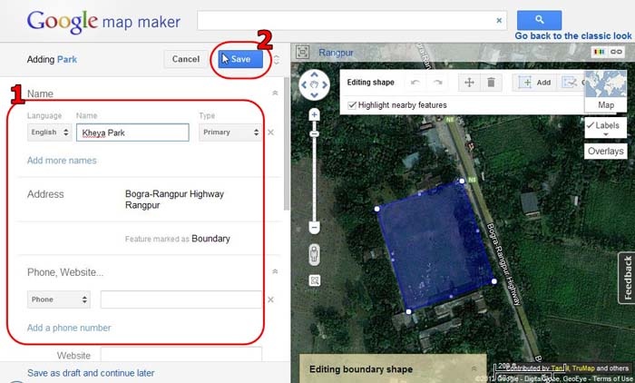 এবার (1) নং ঘরে পার্কের নাম, তথ্য দিয়ে (2). Save করুন। পার্ক তৈরী!! 😀