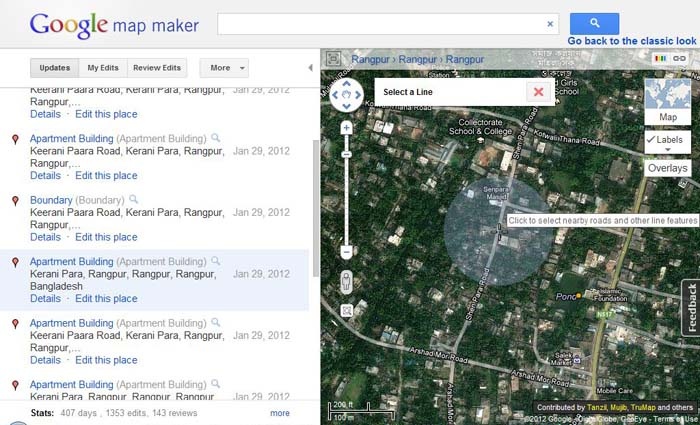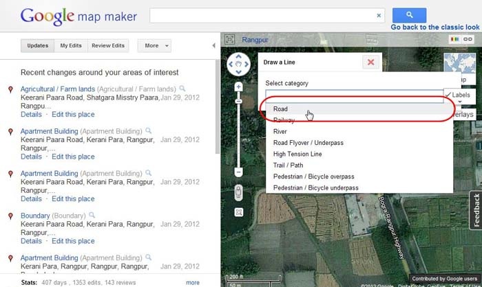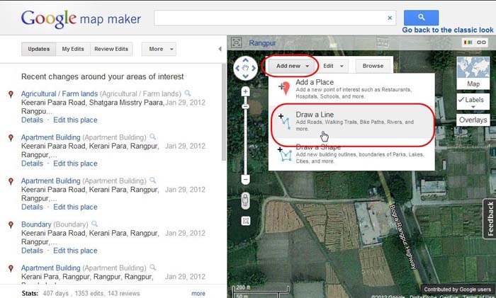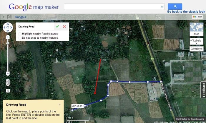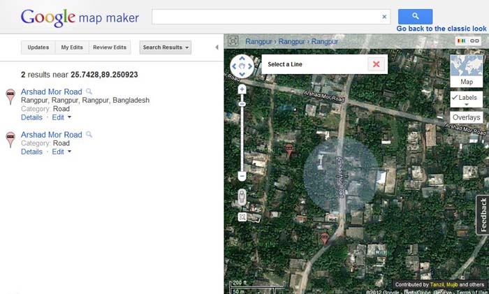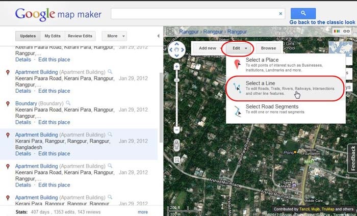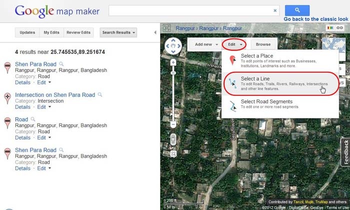 ধরুন আপনার এলাকার কোন রাস্তার নাম ভুলভাবে ম্যাপে রয়েছে, বা রাস্তাটি স্যাটেলাইট চিত্র থেকে সরে গেছে। এটি সংশোধন করার জন্য Edit থেকে Select a Line এ ক্লিক করুন।