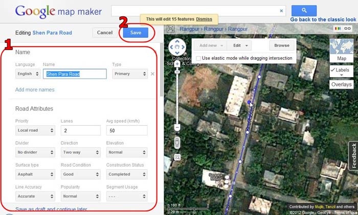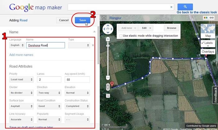 (1) এ রোডের নামটি প্রবেশ করান (2) সেভ করুন। আর রোড ভুল অবস্থানে থাকলে বলগুলো মাউস দিয়ে টেনে টেনে ঠিক জায়গায় বসিয়ে সেভ করুন। 😀
