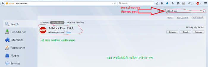 আসার পর সার্চ করুন (Adblocks Plus)। তারপর ইন্সটল করবেন। ইন্সটল করা হলে আপনার মজিলা ফাইয়ার ফক্সটি রি-স্টার্ট করুন। এবার দেকুন আপনার অ্যাড- অন্স টি কাজ করছে কিনা।