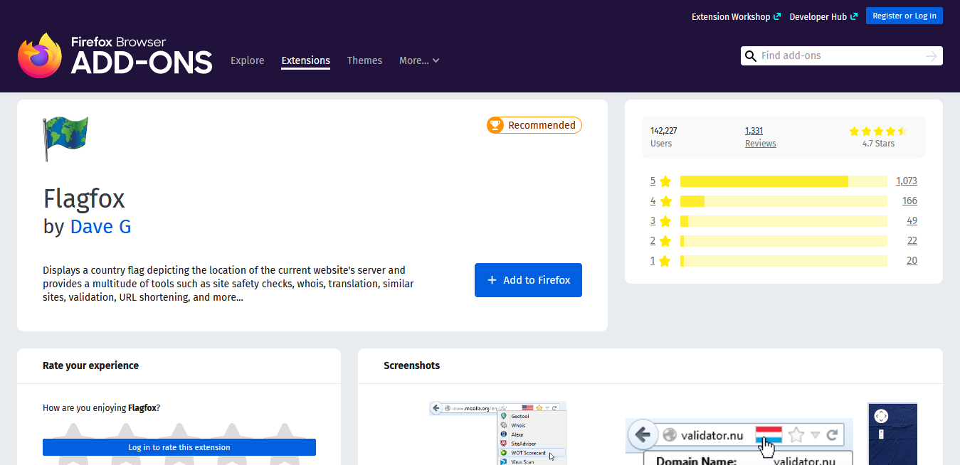 ফায়ারফক্স ব্রাউজারের জন্য Flagfox হচ্ছে খুবই উপকারী অ্যাড-অন। এই অ্যাড-অন ইন্সটল করা হলে আপনার ফায়ারফক্স ব্রাউজারের অ্যাড্রেস বারের ডানদিকে পতাকার মত একটি আইকন দেখতে পাবেন। আর এই পতকা আইকনে ক্লিক করলে আপনি যে ওয়েব সাইটটি ব্রাউজ করছেন তার লোকেশন ট্রাক করে। এর সাথে সাথে আপনি গুগল ম্যাপস ওপেন করে IP এর সোর্স এরিয়া সার্চ করে বের করতে পারবেন। এছাড়াও এই অ্যাড-অন এ আরও অনেক উপকারী টুলস রয়েছে যেমনঃ Security Check, Whois, Alexa Ranking, Translation, Similar Websites, Verification, Shortening URLs ইত্যাদি। এই প্লাগইন বা অ্যাড-অন অনেকগুলো টুলসকে একত্রিত করেছে যাতে করে ইউজাররা একটি টুলসের সাহায্যেই অনেকগুলো কাজ এক ক্লিকের মাধ্যমেই করতে পারে।