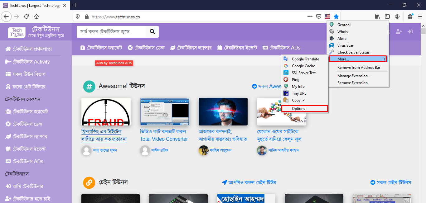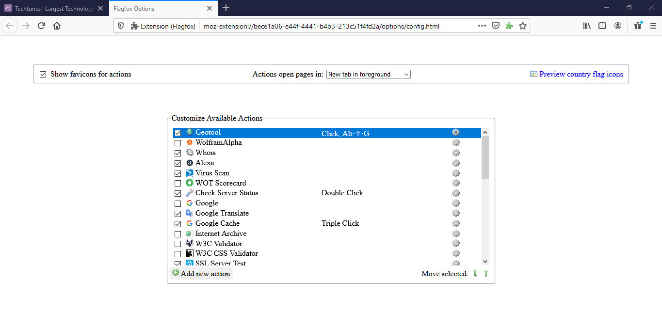 Flagfox এর পতাকা আইকনে রাইট ক্লিক করে More অপশন সিলেক্ট করে Option এ ক্লিক করুন। তাহলে নতুন একটি ট্যাব ওপেন হবে যেখানে Flagfox এর বিল্ট-ইন টুলসগুলো দেখতে পাবেন।