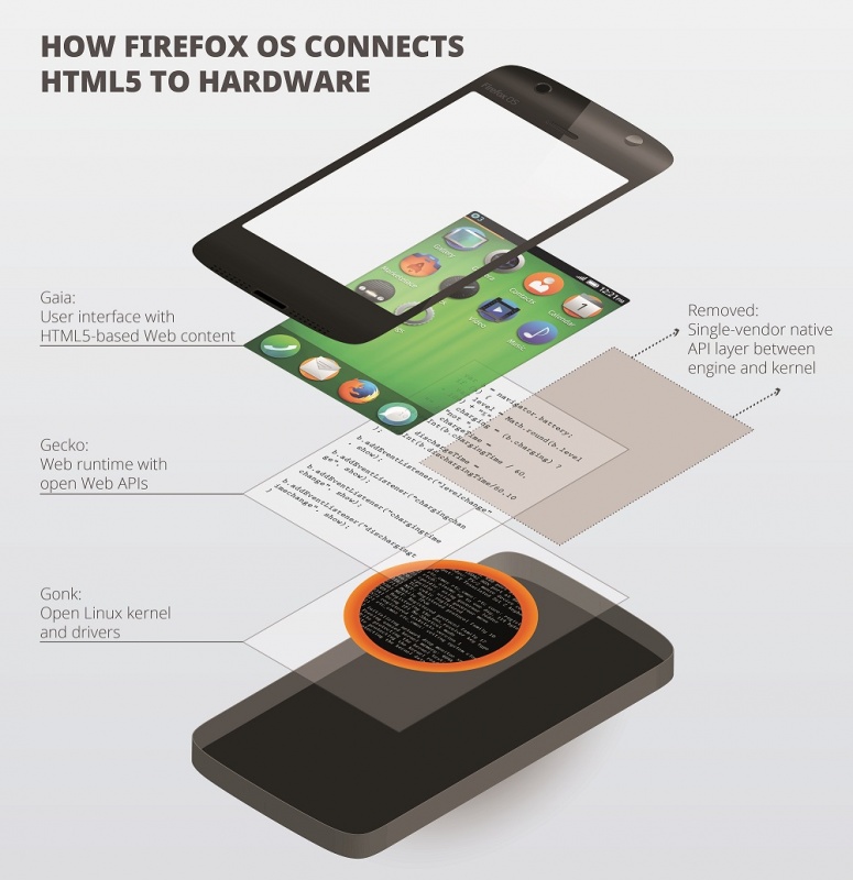 ফায়ারফক্স ওএস কিভাবে একটা ফোন বা ডিভাইস এর হার্ডও্যায়ার সাথে সংযুক্ত হয় তা জানতে নিচের ছবির লেয়ার গুলা ভাল করে দেখুন।