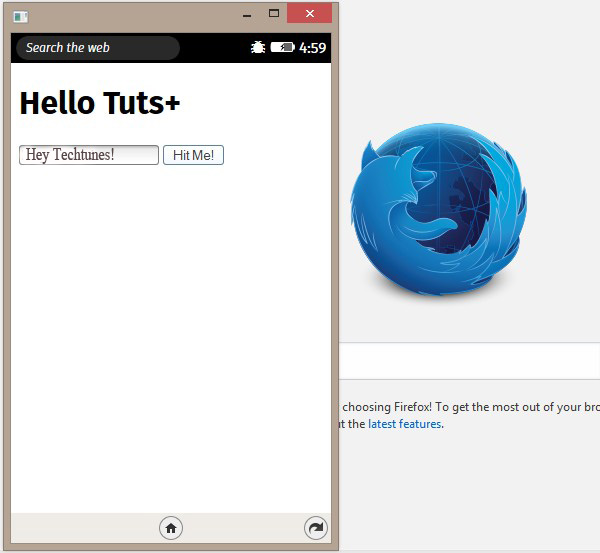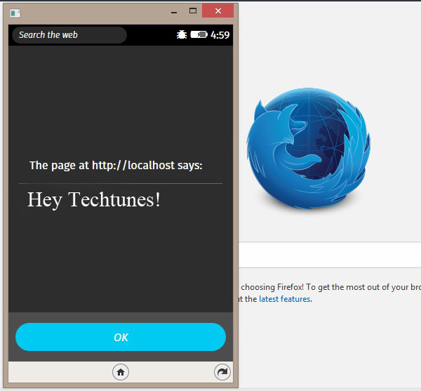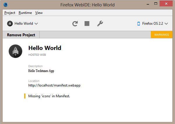 অবশেষে আমাদের একটা ফায়ারফক্স অ্যাপ তৈরী শেষ। এখন এটাকে টেষ্ট করার পালা। এটার জন্য আপনার WebIDE টা ওপেন করতে হবে। তারপর এখান থেকে Project সিলেক্ট করুন এবং তারপর Open Hosted App সিলেক্ট করুন। এটা আপনার কাছে আপনার অ্যাপের manifest ফাইলের লোকেশন চাইবে। যেহেতু এক্ষেত্রে আমি লোকালহোস্ট ইউজ করেছি তাই এই ইউআরএলটা হল : http://localhost/manifest.webapp। এই লোকেশনটা দেবার পর আপনার সিমুলেটর আপনার অ্যাপটা ইনস্টল করে নিবে।