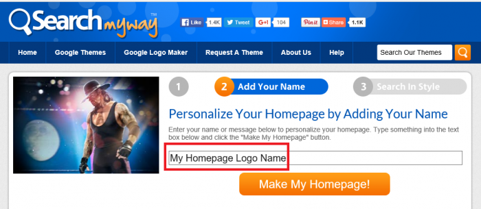 এই কয়েকটি কারনে Search myway আমার পছন্দ যা আপনি অন্য সাইটগুলোতে খুব সহজে করতে পারবেন না। যাই হোক এবার কাজের কথায় আসি। উপরের Search myway এর লোগোতে ক্লিক করুন। আপনার পছন্দের থিম নির্বাচন করুন। পছন্দের থিম এর উপর ক্লিক করুন। নিচের চিত্রের লাল চিহ্নিত জায়গায় লিখাটি মুছে দিয়ে আপনার নাম লিখুন। তারপর Make My Homepage এ ক্লিক করুন।