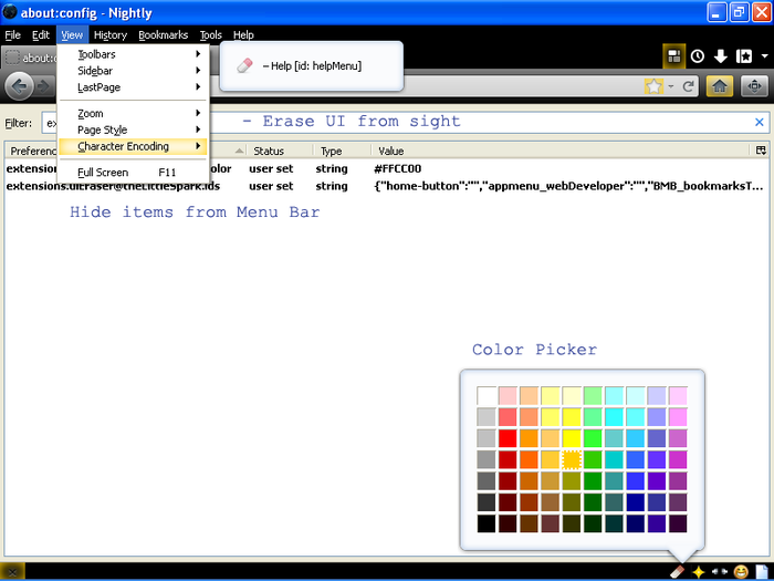UI Eraser : এই অ্যাড-অন টি ব্যবহার করে আপনি আপনার ফায়ারফক্সকে সাজাতে পারবেন ইচ্ছামত। নাম দেখেই বোঝা যাচ্ছে এখানে ব্রাউজারে নতুন কিছু যোগ করা নয়; বরং অনেক কিছু মুছে ফেলতে পারবেন। ধরুন মাউস এর রাইট বাটনে ক্লিক করার পর যে কনটেক্সট মেনু আসে এখান থেকে যেকোন কিছু রিমুভ করতে পারবেন। আবার মেইন মেনু থেকে কোনো টুলবার দেখতে না চাইলে এখান থেকে মুছে ফেলতে পারবেন। তবে অ্যাড-অন টির ফায়ারফক্স ৩৫ আপডেটের সাথে কিছু সমস্যা থাকলেও ডেভেলপার চেষ্টা করছেন সেটি ঠিক করে ফেলার।