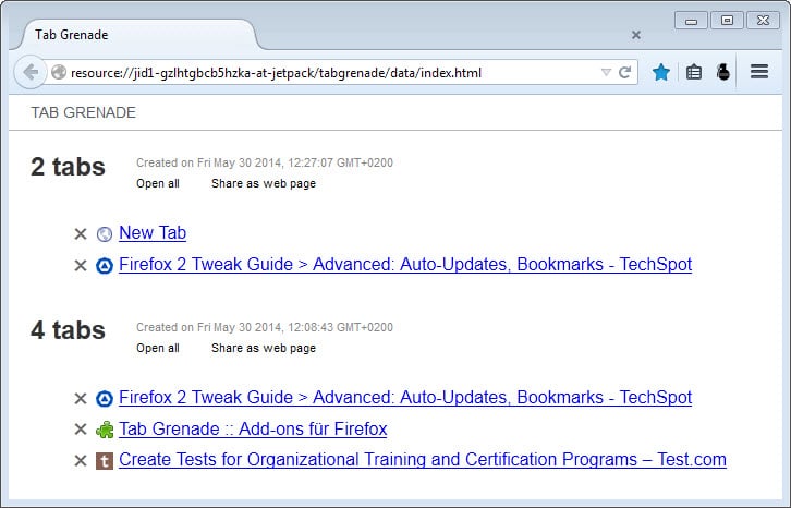 Tab Grenade : ফয়ারফক্সকে স্লো হওয়া থেকে বাচানোর উপায় আপনি যে ট্যাবগুলো ব্যবহার করছেন না তা মুছে ফেলা। তবে অনেকসময় আপনি এই কাজটি করতে চাননা। তাই ট্যাবগুলো মুছে না ফেলে এই অ্যাড-অন ব্যবহার করুন। এতে করে আপনার ট্যাবগুলো লিস্টআকারে প্রদর্শিত হবে। এতে করে আপনার ব্রাউজার আগে থেকে হয় আরও দ্রুতগতির হয়।